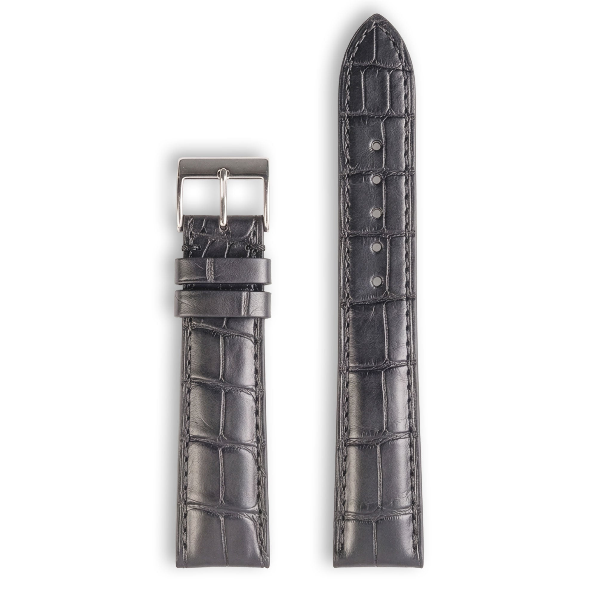 Genuine alligator leather watch strap. Black rubberized calf lining. 4,5mm (0.18 inch) rounded thickness at the watch, tone on tone stitching.