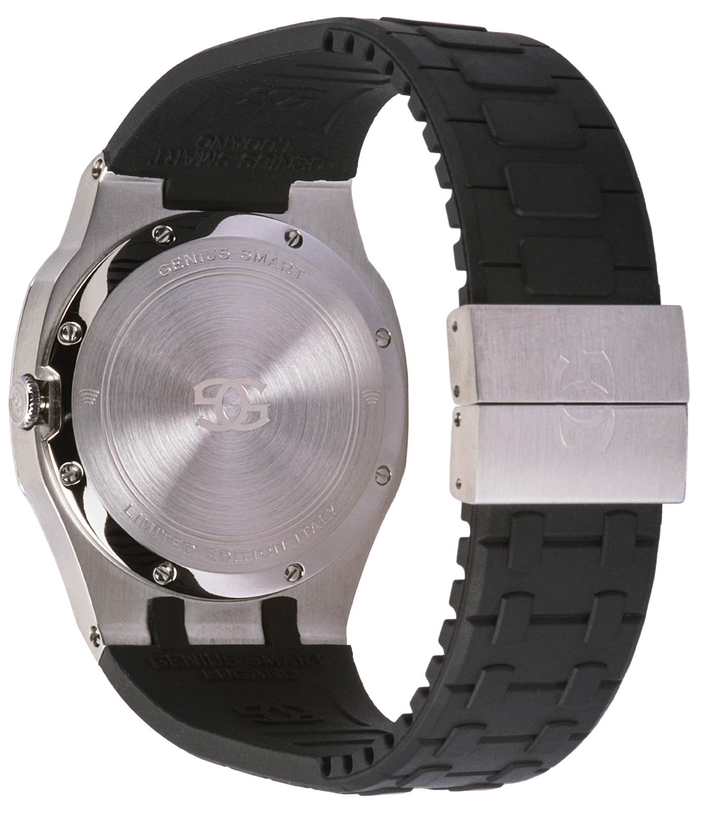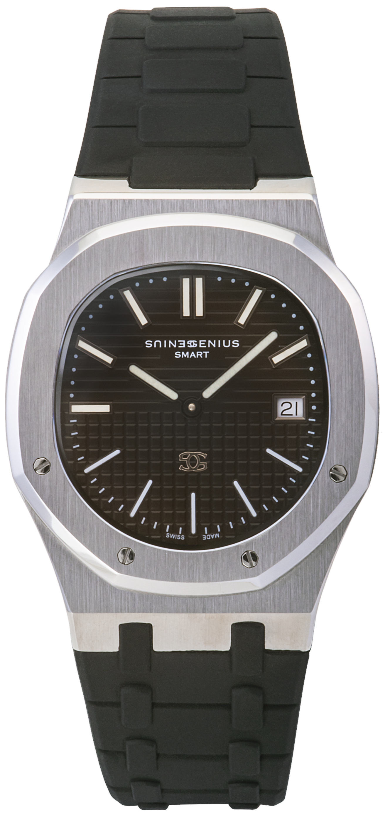 La deuxième création, la montre Genius Smart, est une évolution des collections précédentes, car nous voulions concevoir une montre de sport avec une nouvelle philosophie. La montre Genius Smart est livrée avec un mouvement à quartz suisse ayant le même design et la même idée que l'Hommage mais avec un bracelet en caoutchouc.