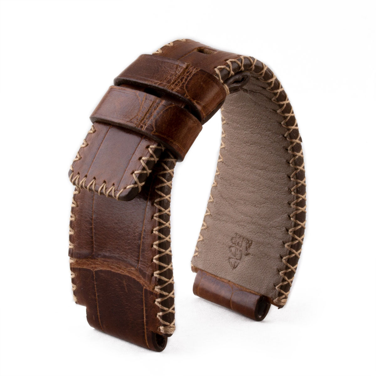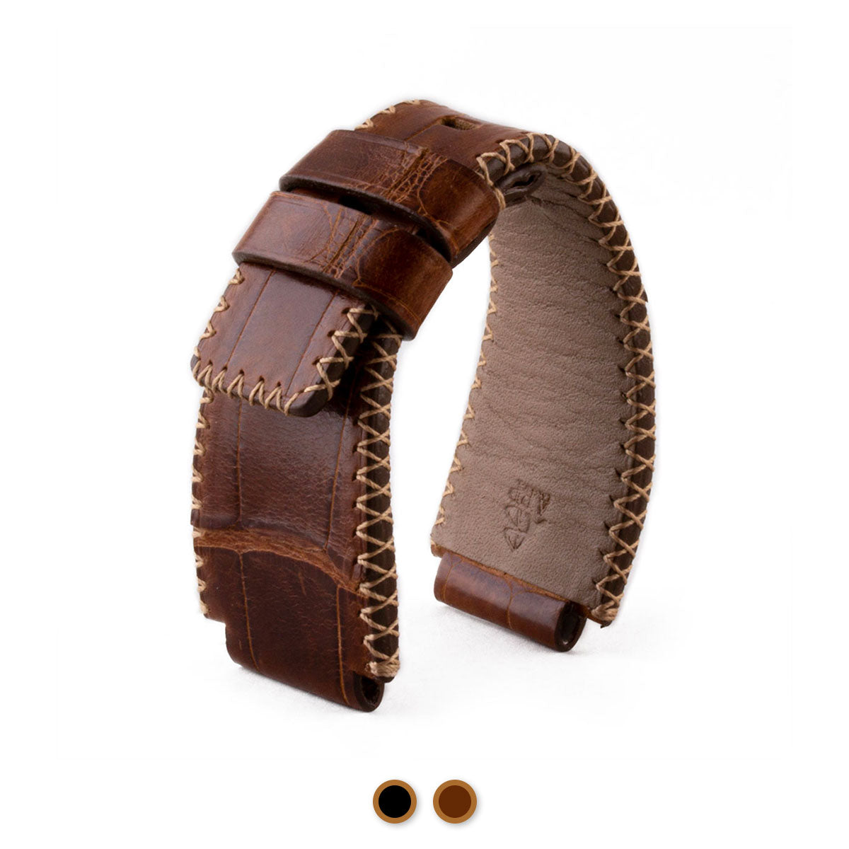 Bracelet de montre Made in France en cuir d’alligator véritable pour montres Bell & Ross BR-01 (aussi compatible avec les modèles BR-03). Couture tribale marron, épaisseur 4mm.