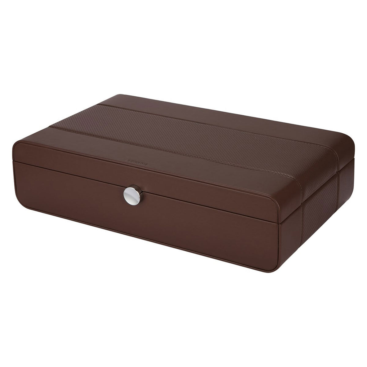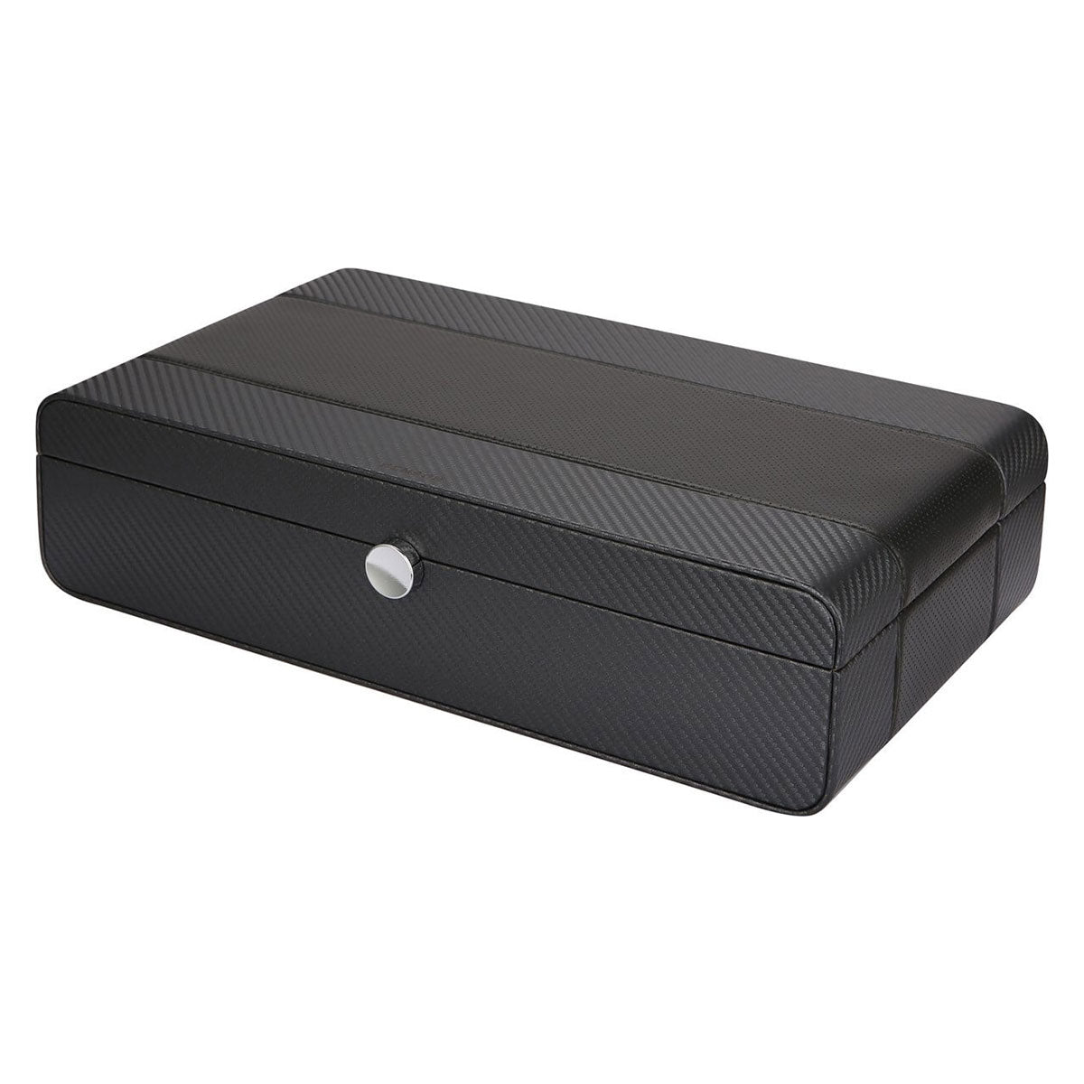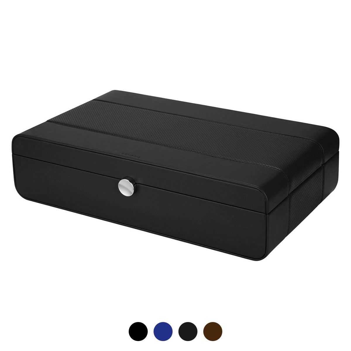 Ces boîtes à montres sont fabriquées en cuir et disponibles dans les couleurs noir, brun foncé, bleu et fibre de carbone. Cette boîte à montres Benson Black Series LWB.12 Black convient au rangement de 12 montres. L'intérieur de la boîte à montres est recouvert d'un tissu doux pour une protection optimale des montres. La serrure sur le devant permet de fermer la boîte à montres. La belle finition se reflète dans les fines coutures et le logo estampé dans le cuir.