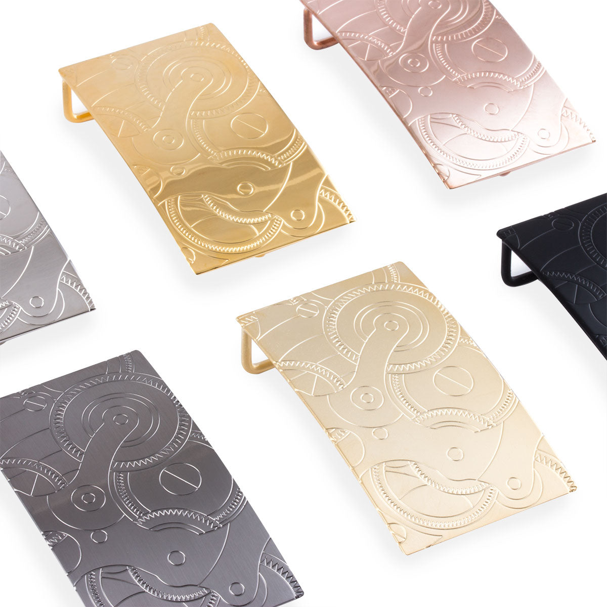Boucles ABP en acier inoxydable gravure horlogerie. Disponible en acier, acier brossé, dorée, dorée rose, PVD doré et PVD noir.