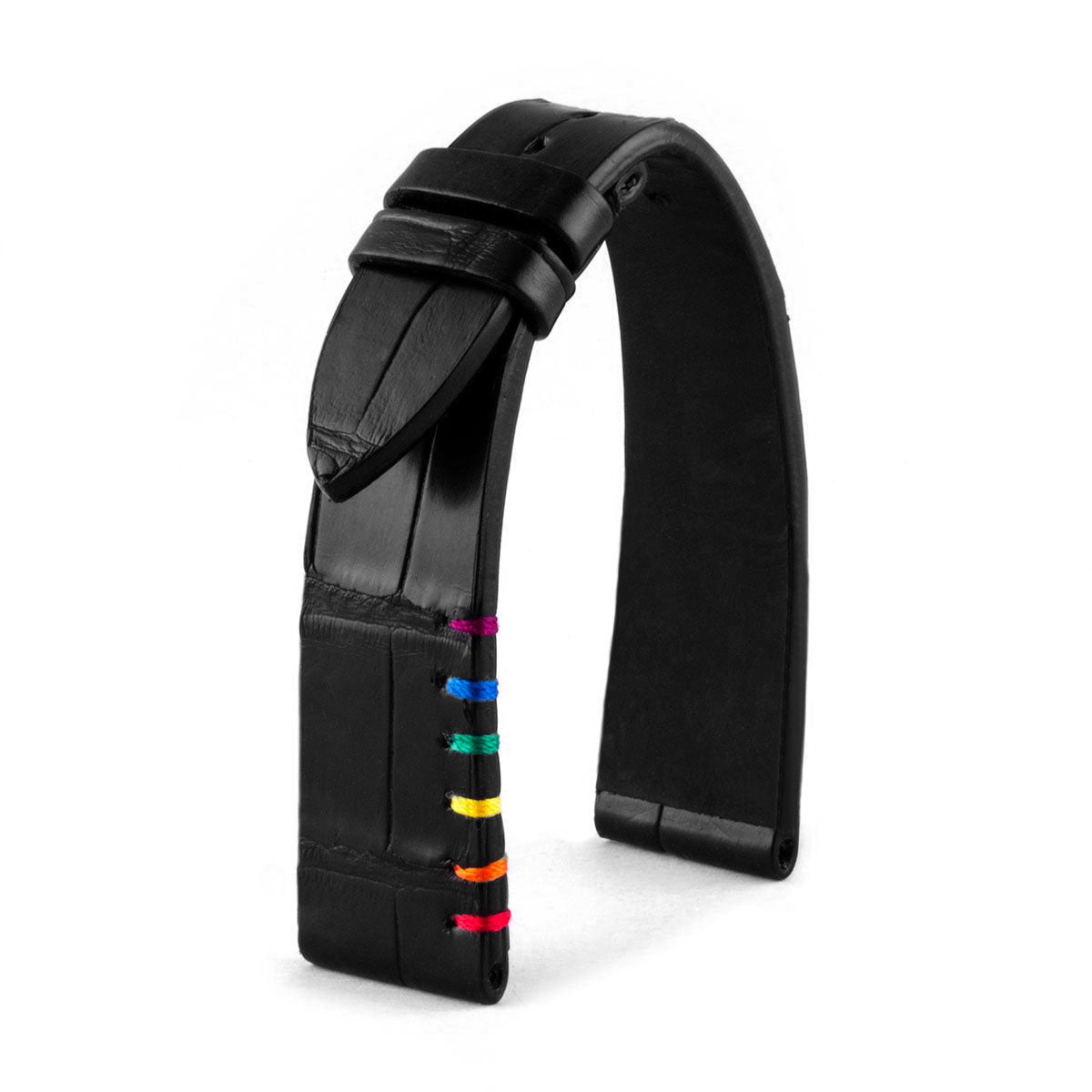 Bracelet-montre classique qualité premium en cuir d'alligator véritable. Doublure veau caoutchouté noir. Epaisseur à entrecorne plat 3mm, points d'arrêt rouge, orange, jaune, vert, bleu, violet.