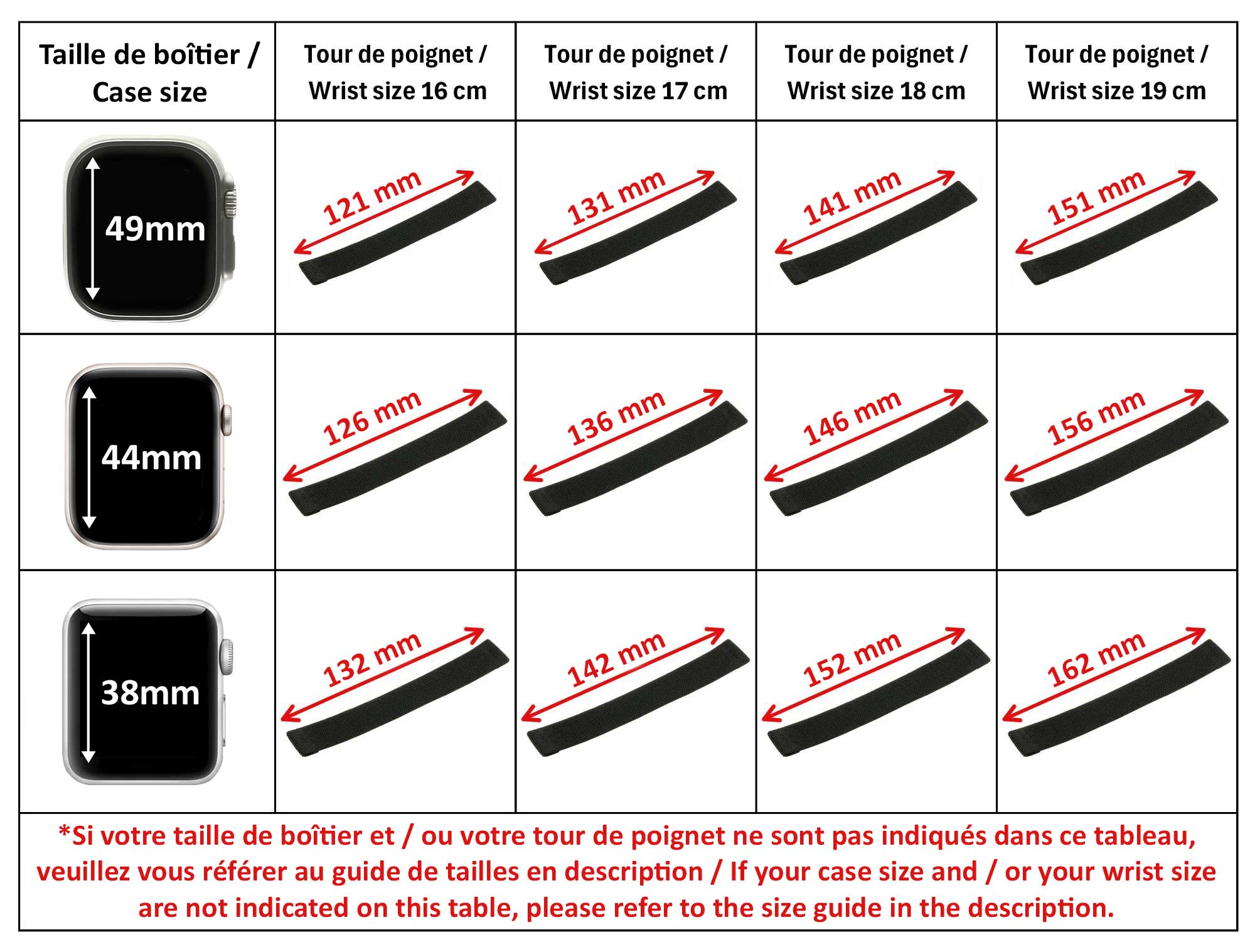 Apple Watch 38mm, 40mm, 41mm, 42mm, 44mm, 45mm et 49mm.