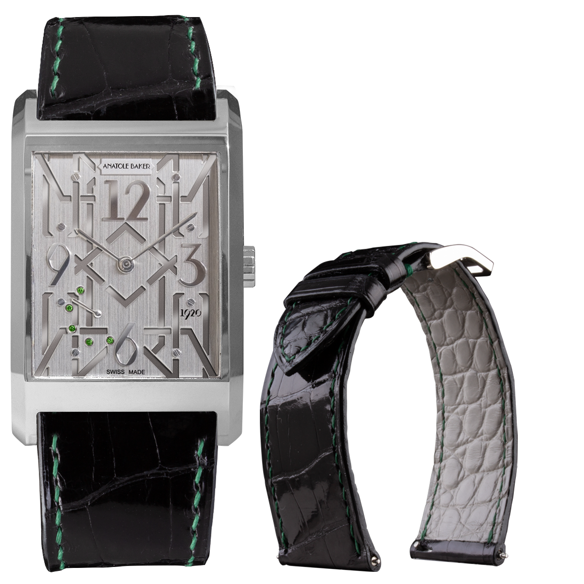 Bracelet montre cuir premium - Anatole Baker - Alligator brillant noir couture verte