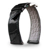 Bracelet-montre classique en cuir d’alligator brillant véritable noir pour montres Anatole Baker . Doublure en alligator écailles rondes grise. Epaisseur à entrecorne plat 2mm, couture verte.