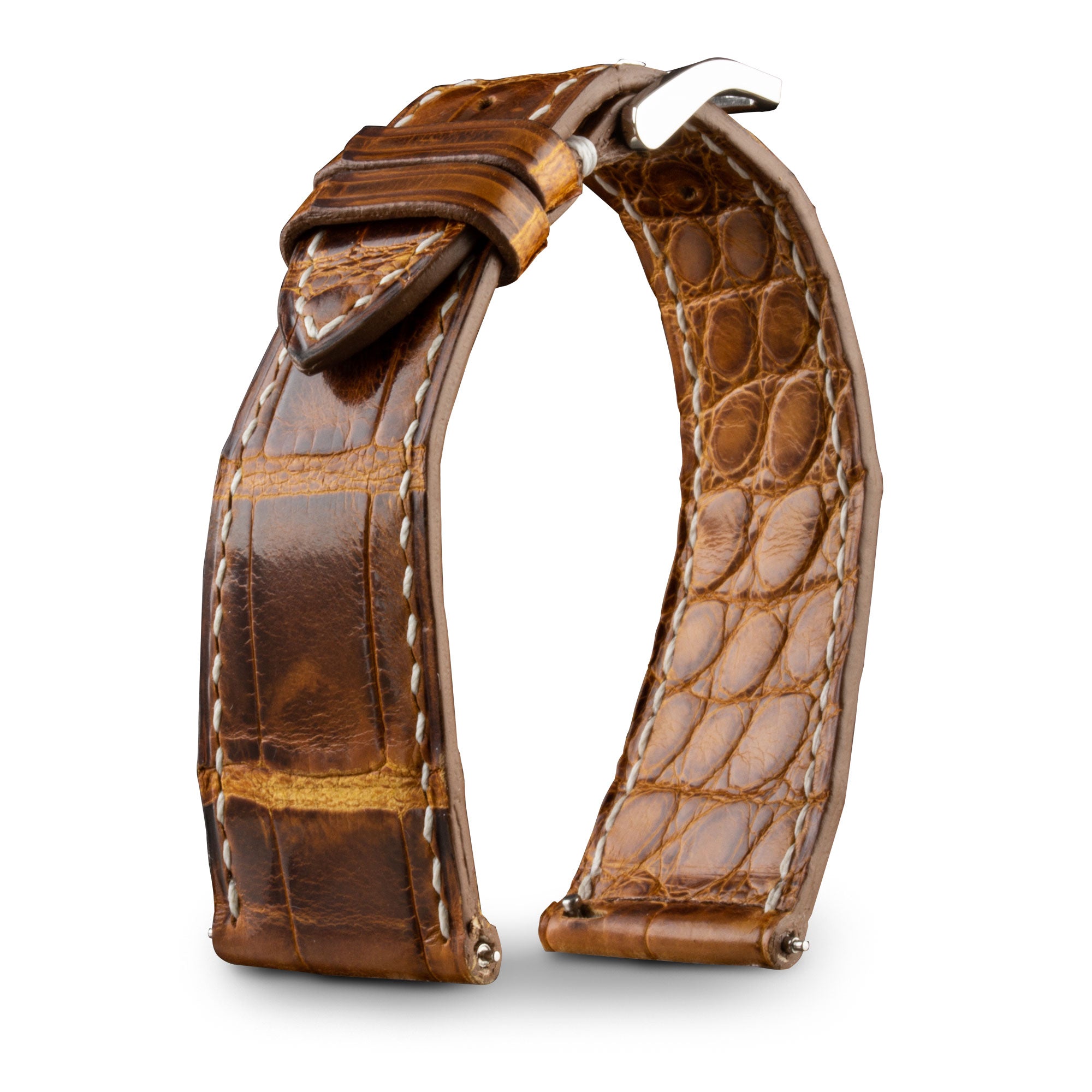 Bracelet montre en alligator, tannage waxé, écailles carrées ou rectangulaires.