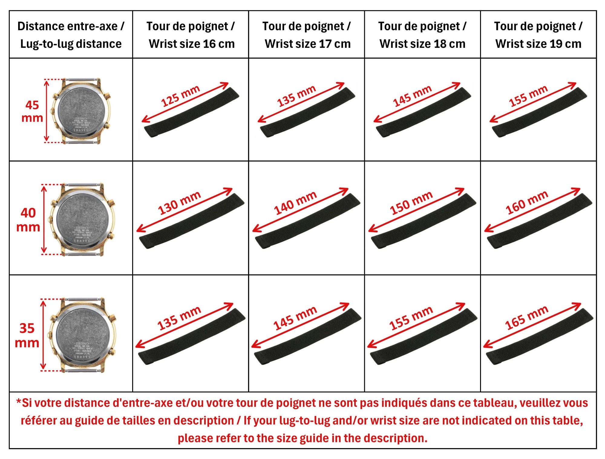 Il vous suffit de soustraire la distance mesurée entre les cornes de votre montre au diamètre de votre poignet, puis d’ajouter 10mm au résultat obtenu. Il ne vous reste plus qu’à sélectionner la longueur de bracelet la plus proche.