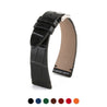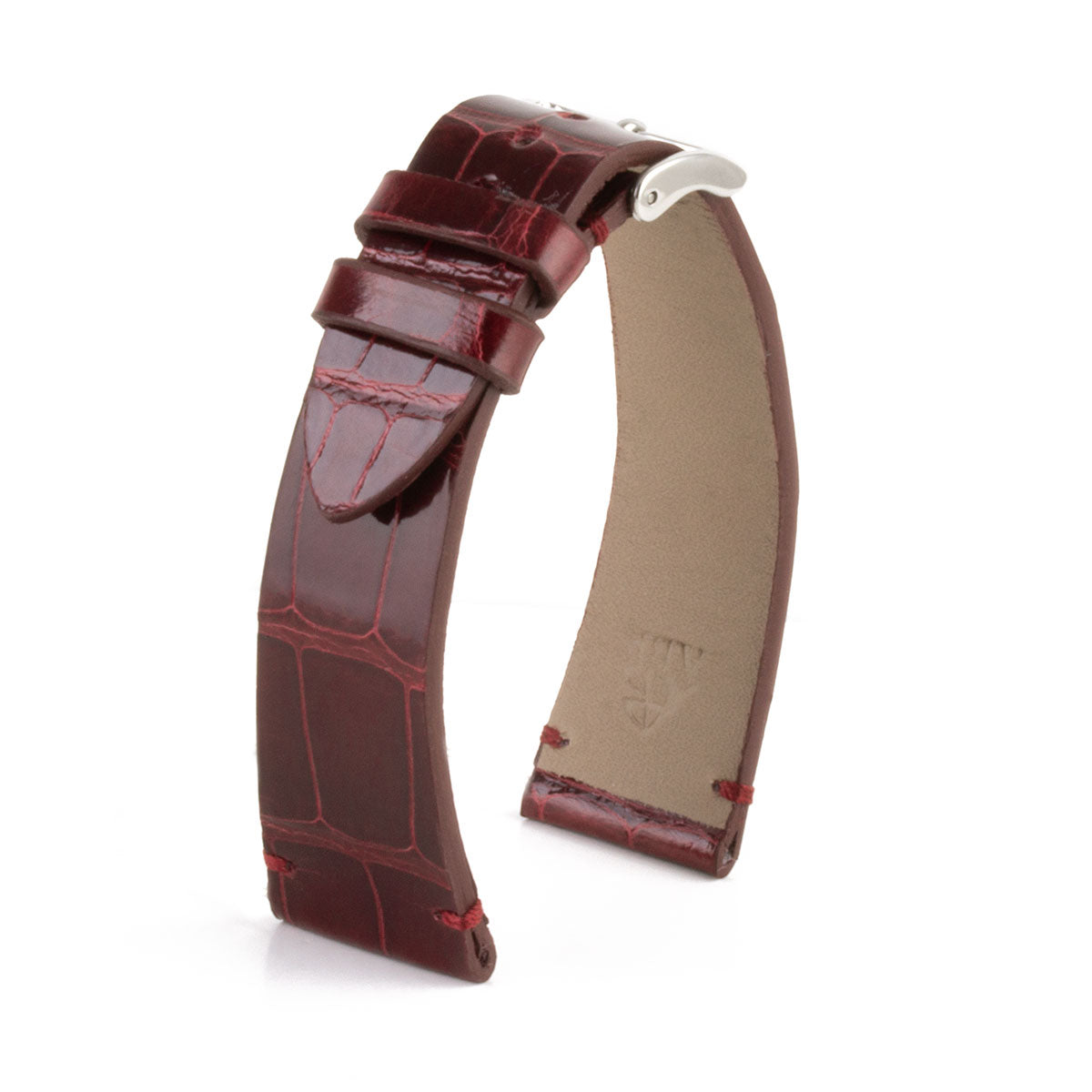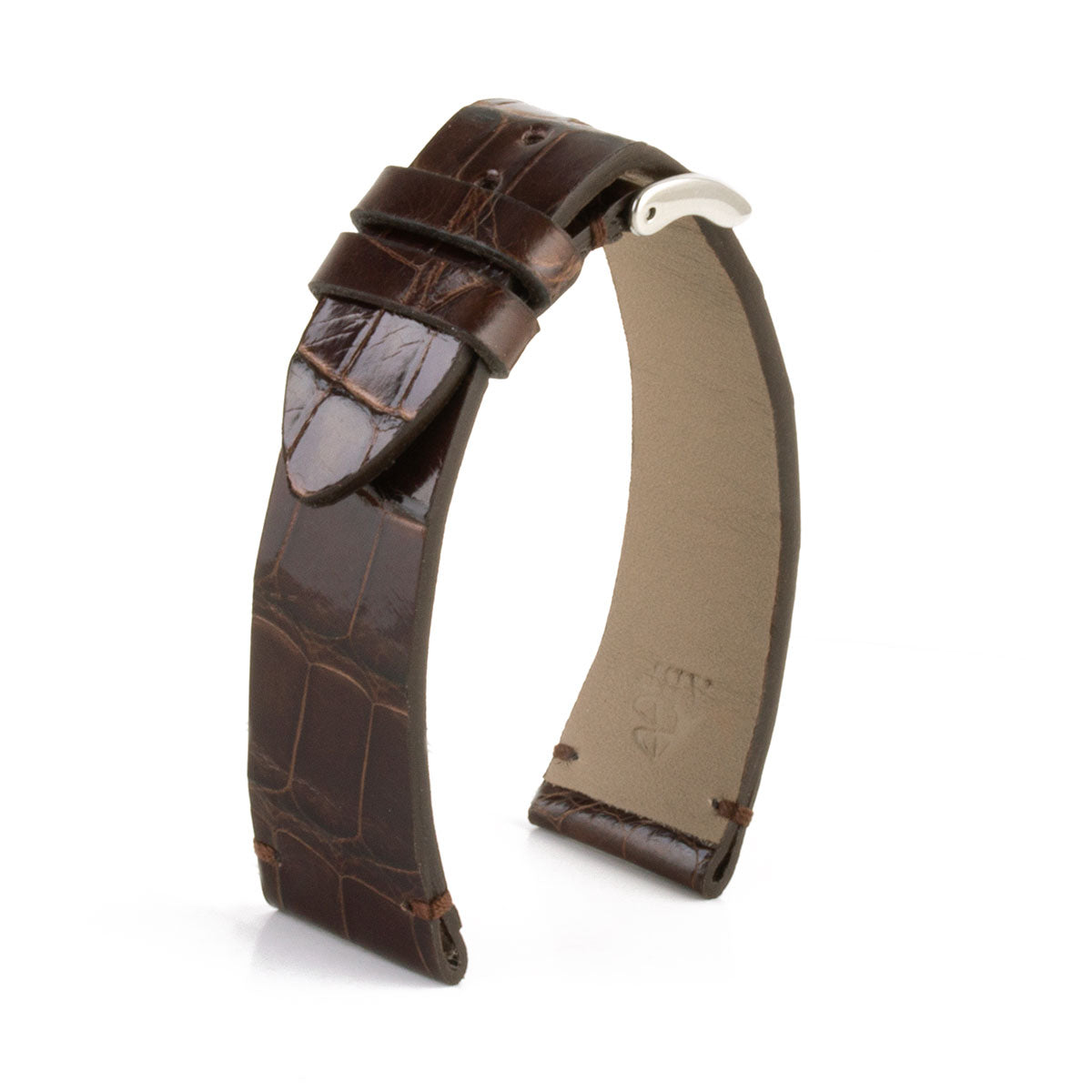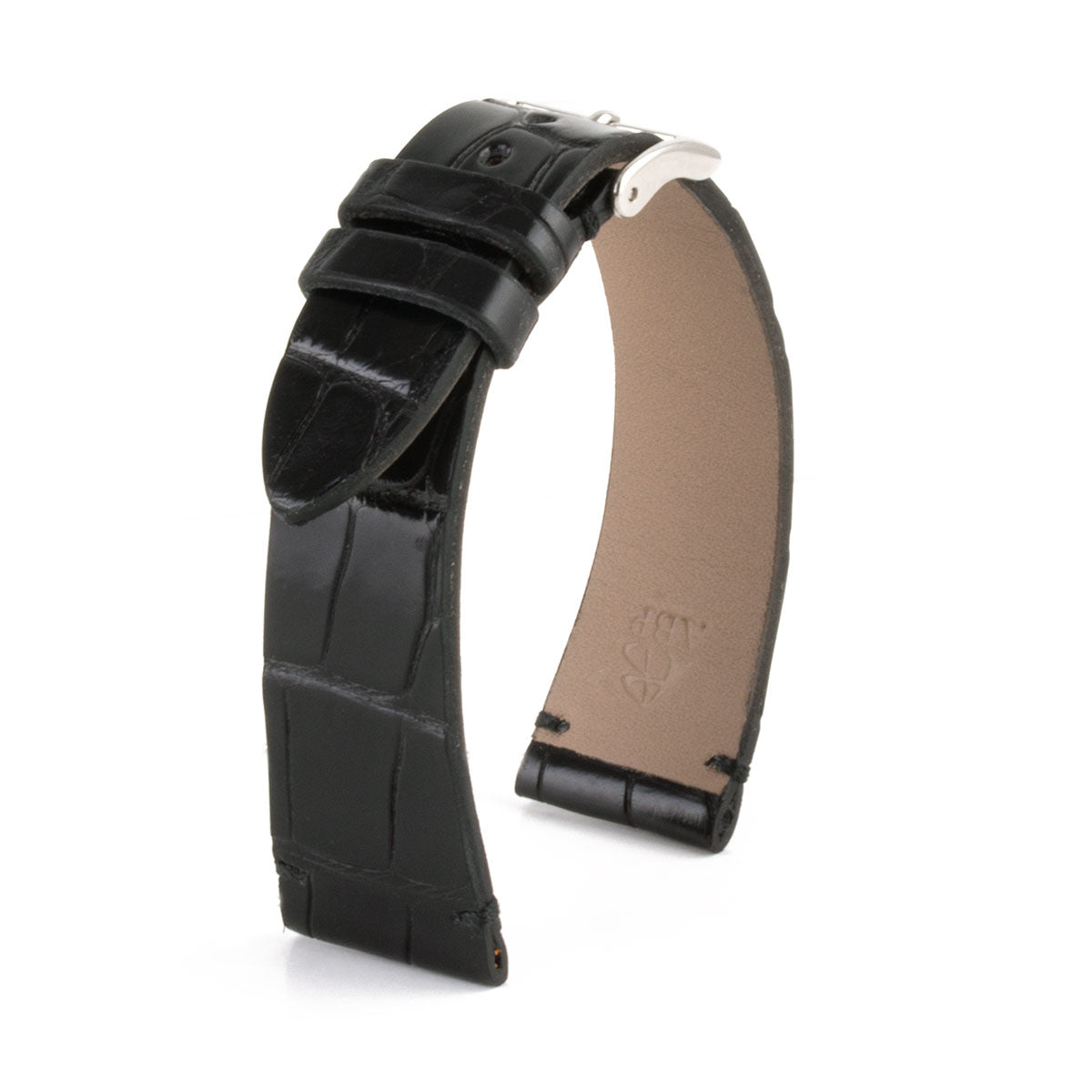 La gamme de bracelets la plus confortable qui soit. Bracelet montre classique ultra plat qualité premium en cuir d'alligator brillant. Epaisseur à entrecorne plat 2,5mm, doublure veau classique, couture points d'arrêt ton sur ton, tranches vieillies.