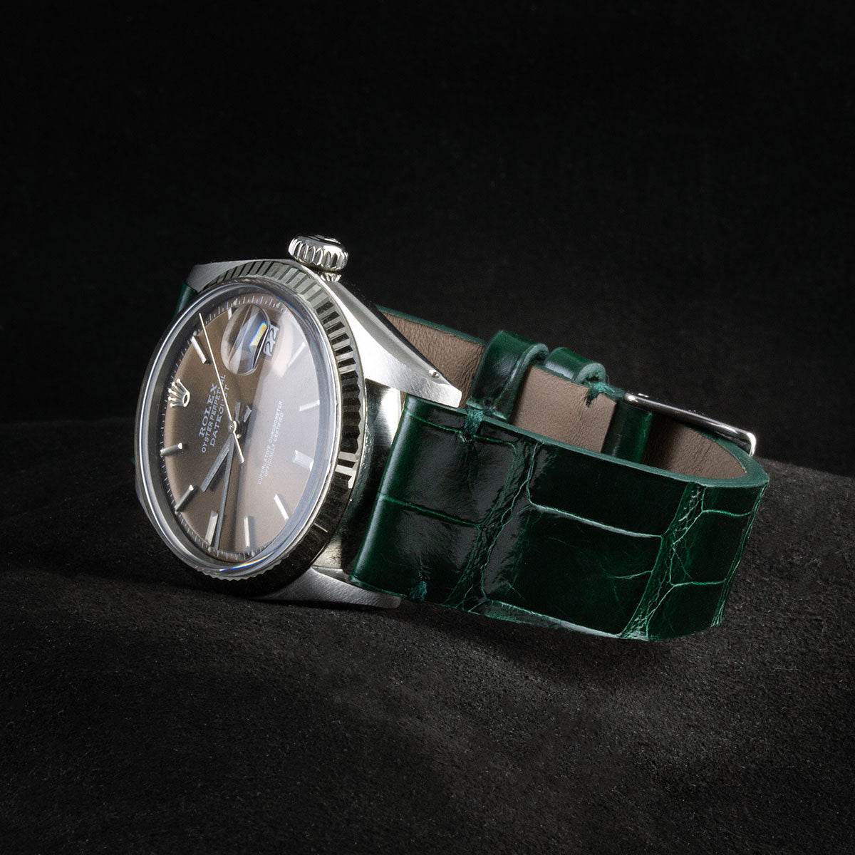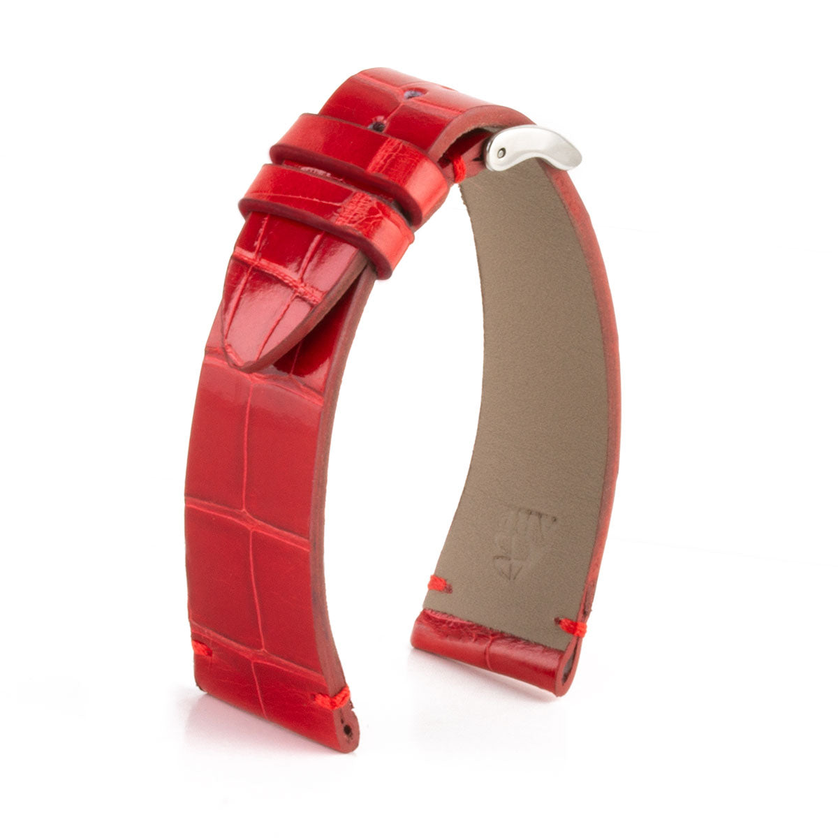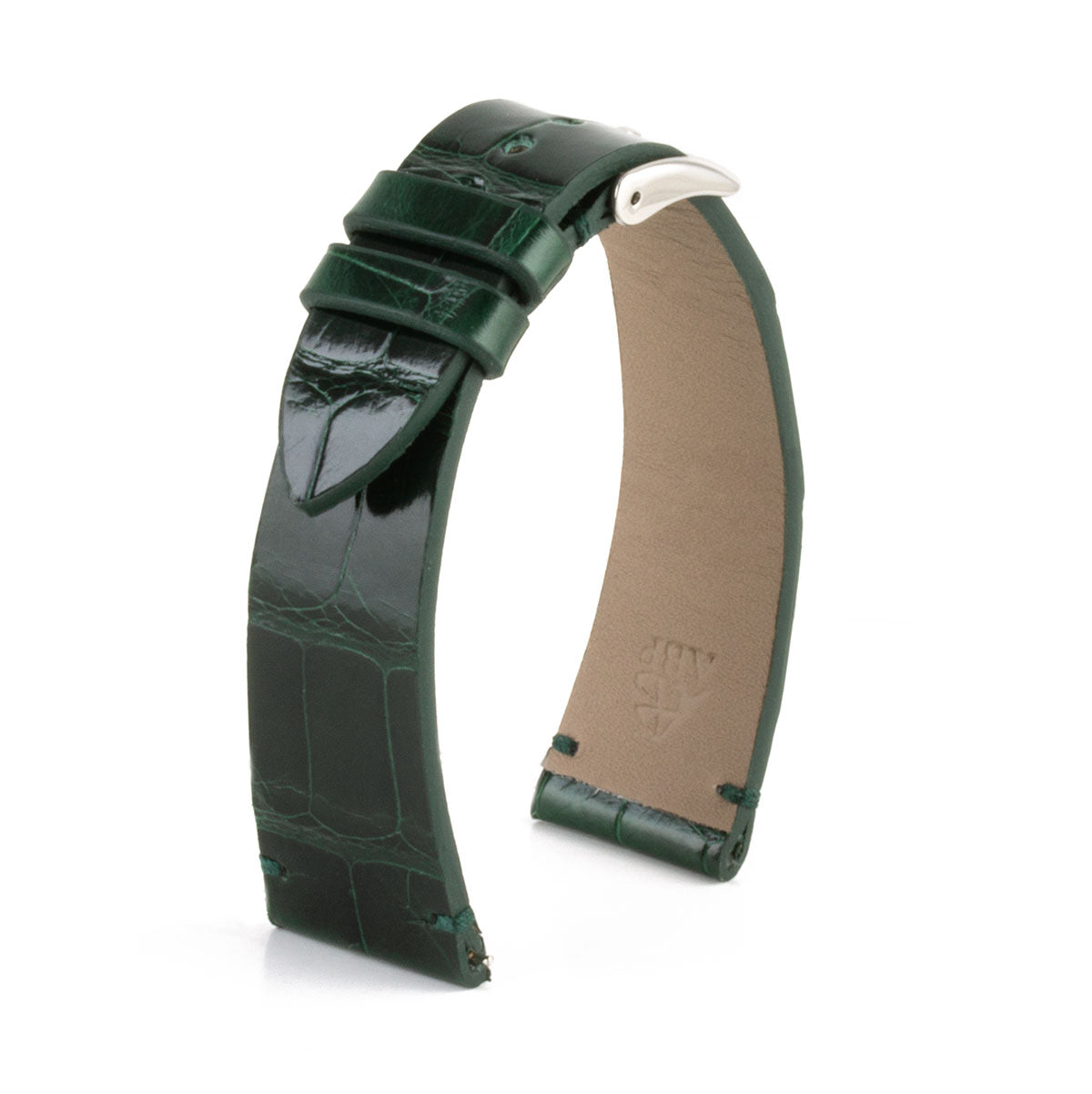 Bracelet de montre en alligator, tannage brillant, écailles carrées ou rectangulaires.