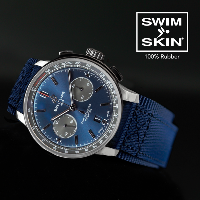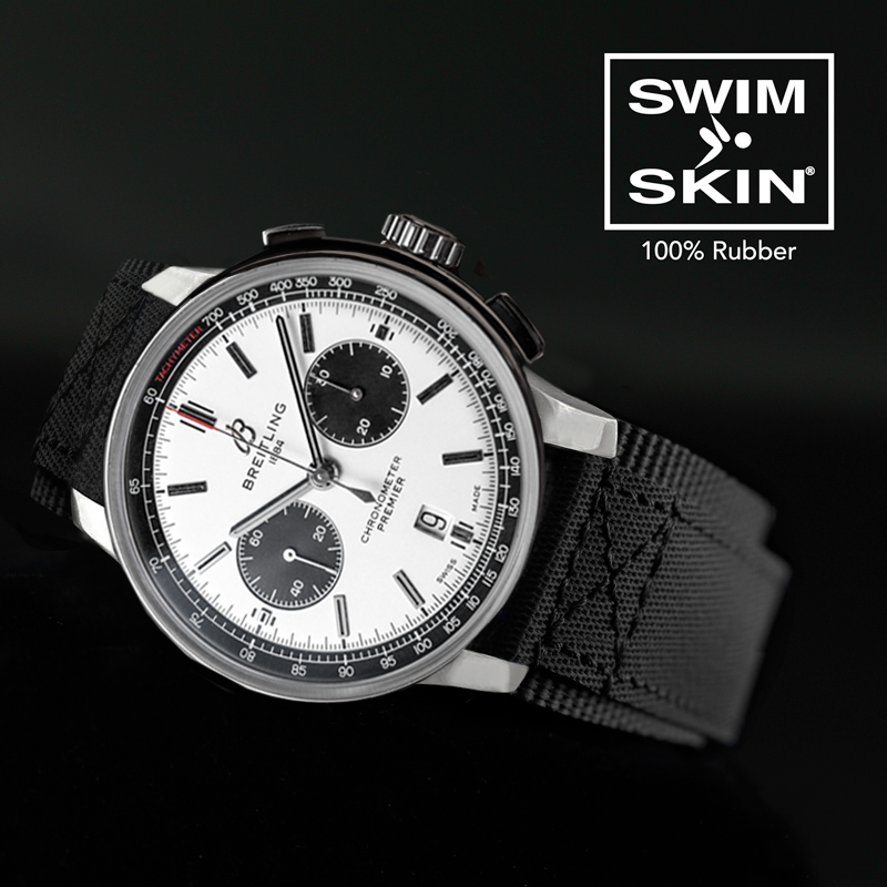 Bracelet-montre de type “combat” ou militaire en caoutchouc vulcanisé et de haute technologie conçu pour tous les modèles Breitling d'entre-corne 21 et 22mm. Fabriqué en "SwimSkin®", notre technologie exclusive, unique, brevetée et développée durant plusieurs années, nécessitant des machines d’extrême précision et des techniques d’ingénierie innovantes.