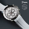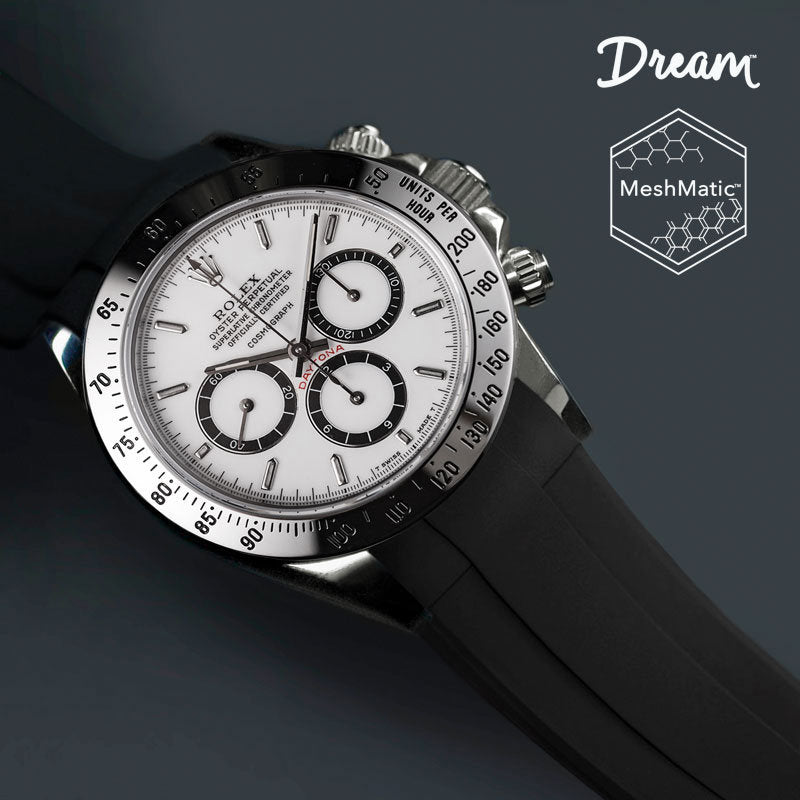 Ce bracelet souple en caoutchouc vulcanisé est spécifiquement calibré pour s'adapter à la Rolex Daytona (2022 et modèles précédents) montée sur un bracelet Oyster en acier inoxydable, bicolore ou en or jaune (voir notes). Le Dream Strap est doté de la technologie MeshMatic (brevet en cours) pour un ajustement parfaitement précis et confortable à votre poignet. Ce bracelet utilise la technologie « Blocked Integration », incorporant des inserts solides pour un montage impeccable et sans mouvement sur le boîtier Daytona* et présente le design en « T » caractéristique de Rubber B.