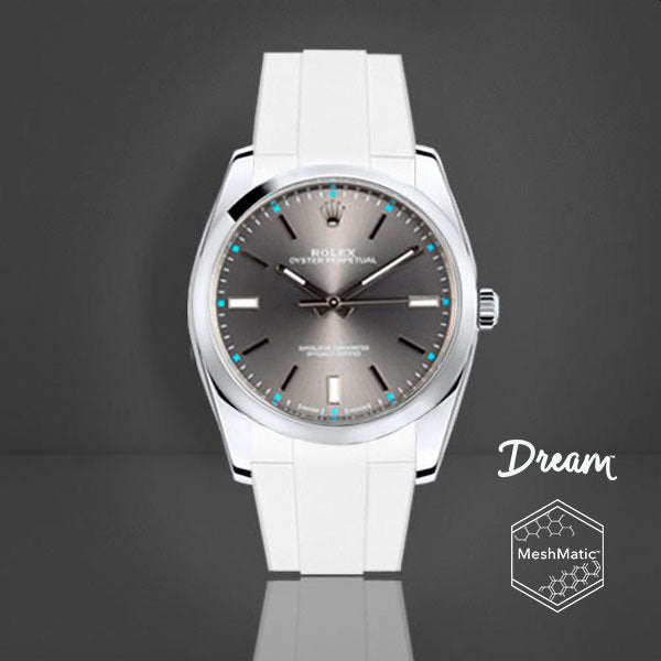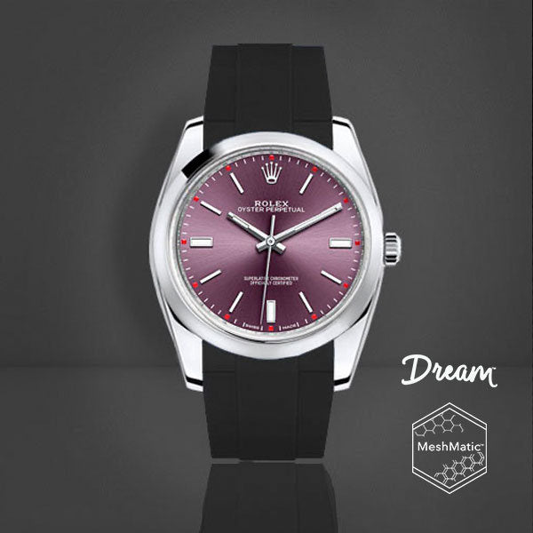 Ce bracelet en caoutchouc véritable vulcarboné est précisément calibré pour la montre Rolex Oyster Perpetual (39mm seulement). Le Dream Strap est doté de notre technologie MeshMatic (brevet en cours) pour un ajustement parfaitement précis et confortable à votre poignet. Ce bracelet utilise un "Système d'Intégration Bloquée" à inserts, pour une adaptation impeccable et immobile sur le boitier de la montre.