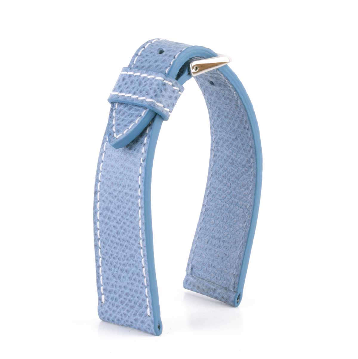 Bracelet de montre en cuir de veau grainé bleu. Epaisseur à entrecorne plat 2,5mm, doublure même cuir, couture blanche, tranches ton sur ton.