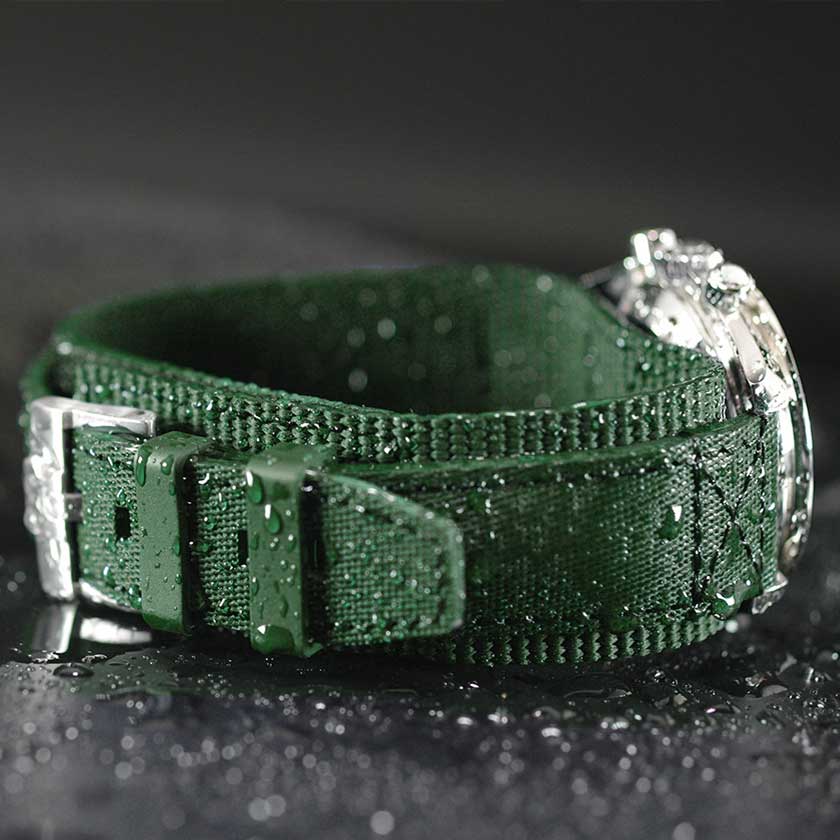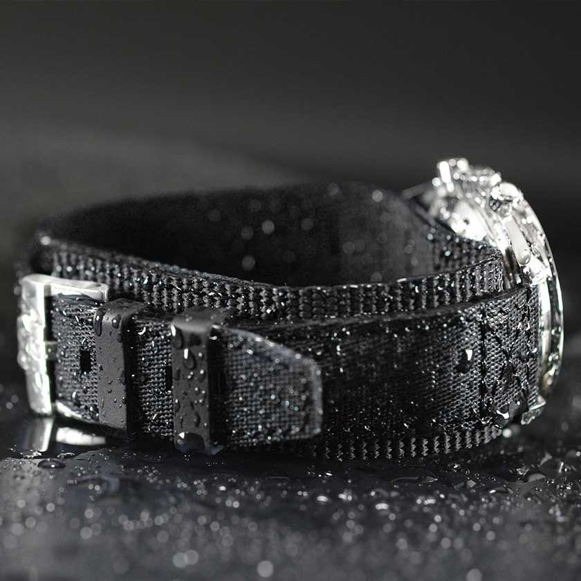 - Bien que ce bracelet semble être fait avec un matériel sensible à l'humidité, tel que le Kevlar®, il est en réalité 100% en CAOUTCHOUC. Il est donc imperméable et idéal pour toutes les activités sportives et aquatiques.