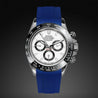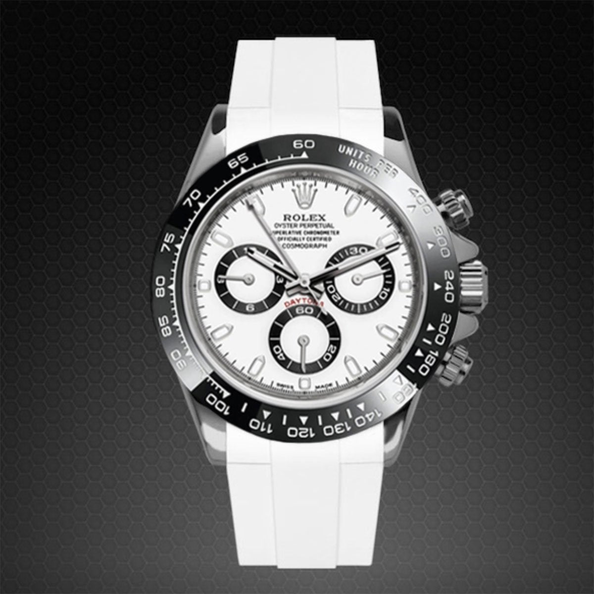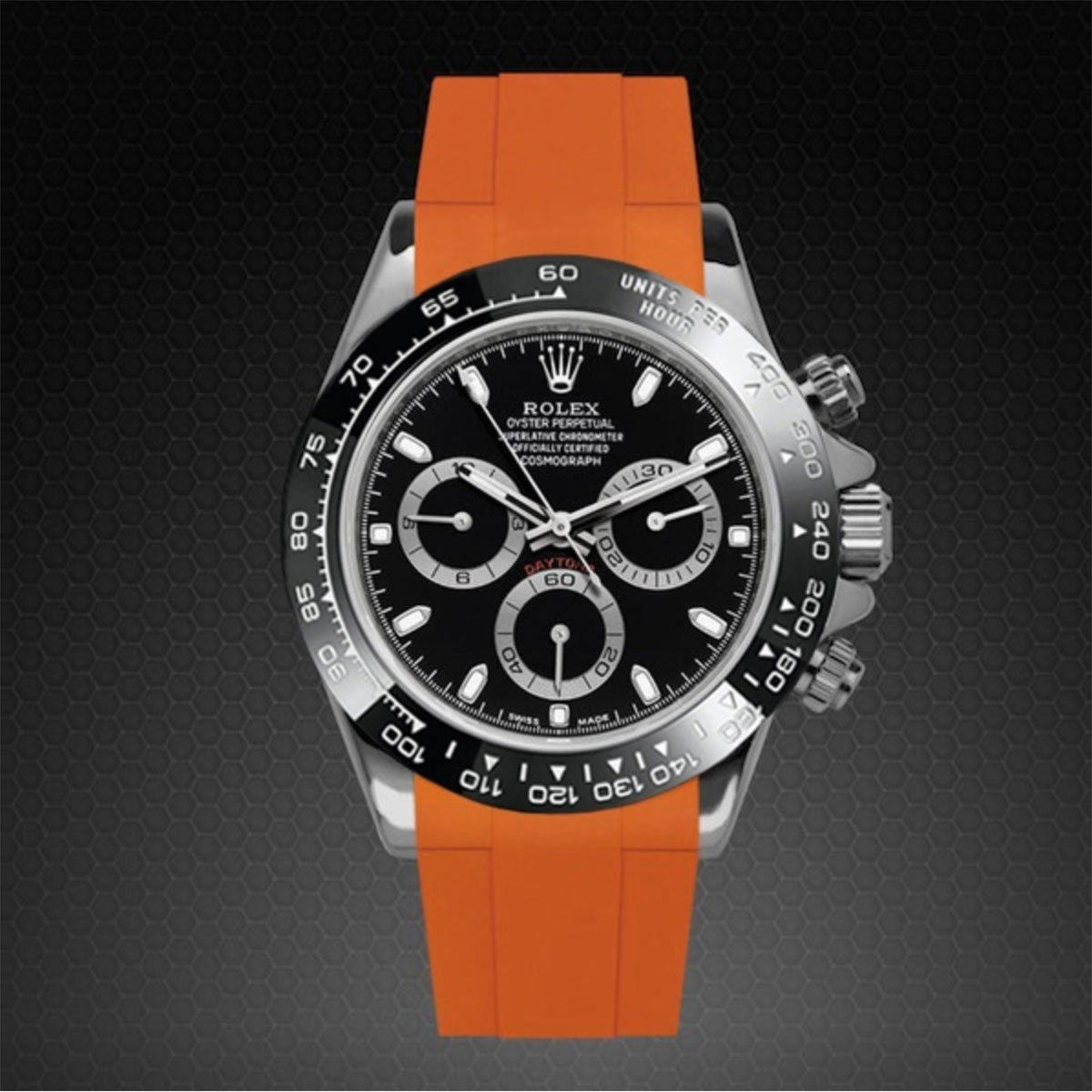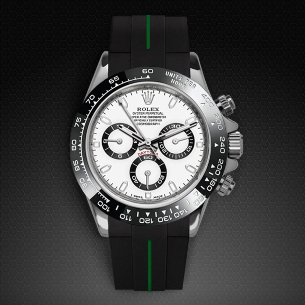 Bracelet en caoutchouc vulcanisé précisément calibré pour s'adapter à la Rolex Daytona (2022 et précédentes) sur bracelet Oyster en acier inoxydable, bicolore ou en or jaune (voir notes). Ce bracelet utilise la technologie « Blocked Integration », incorporant des inserts solides pour un montage impeccable et immobile sur le boîtier de la Daytona*.