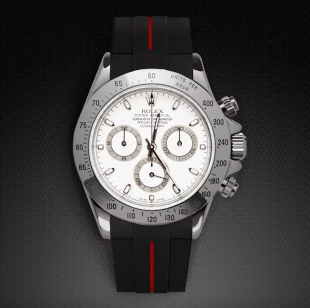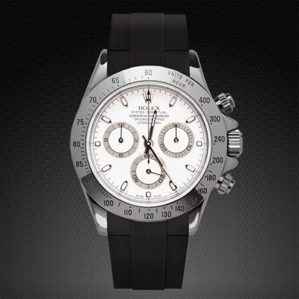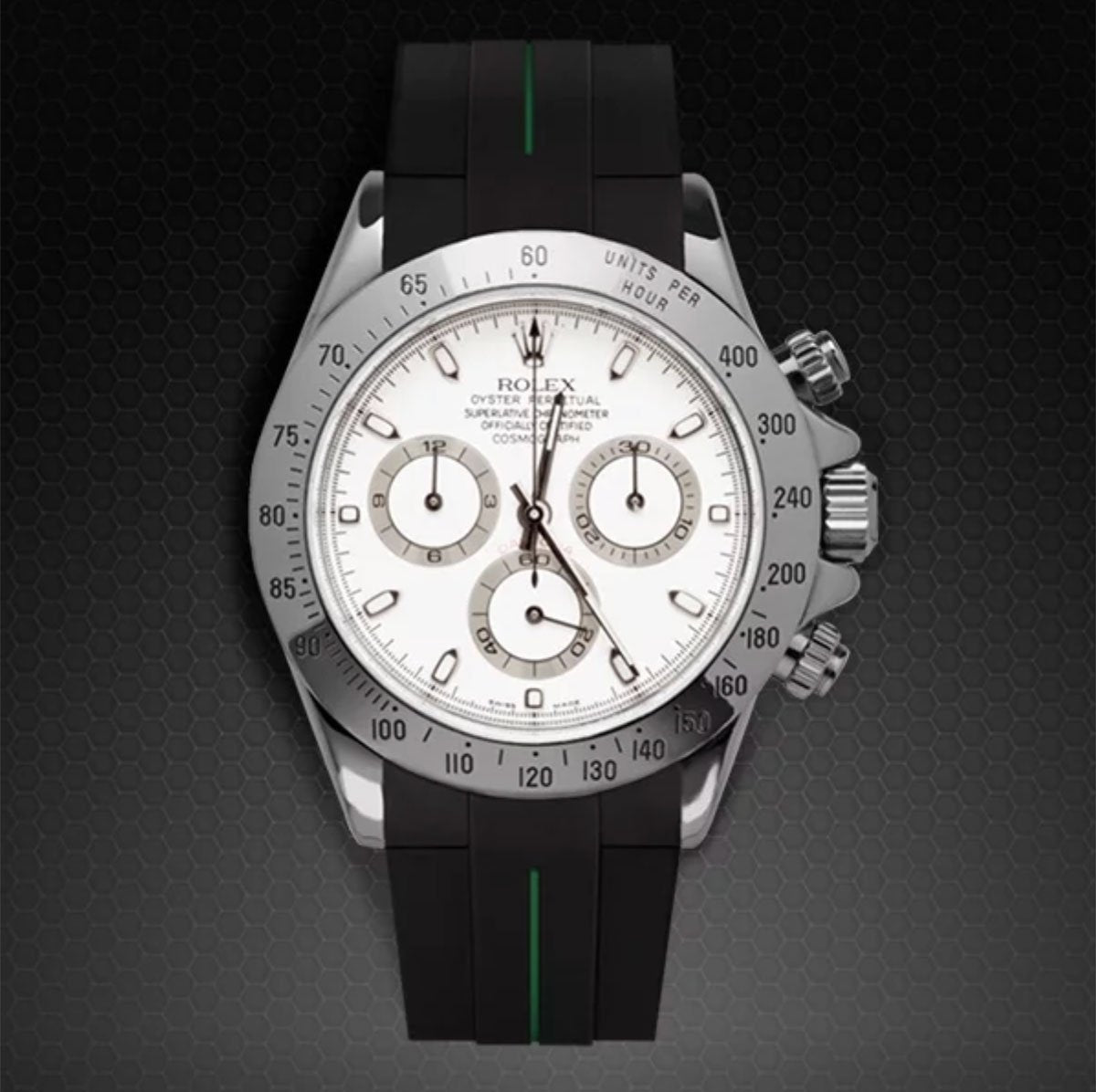 Bracelet en caoutchouc vulcanisé précisément calibré pour s'adapter à la Rolex Daytona (2022 et précédentes) sur bracelet Oyster en acier inoxydable, bicolore ou en or jaune (voir notes). Ce bracelet utilise la technologie « Blocked Integration », incorporant des inserts solides pour un montage impeccable et immobile sur le boîtier de la Daytona*.