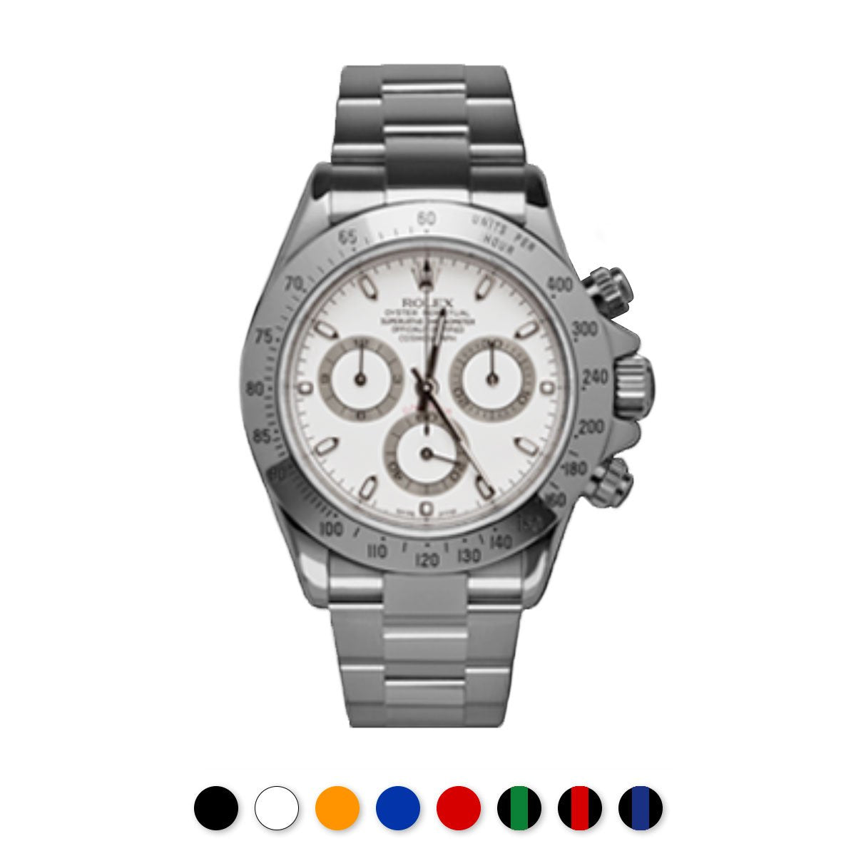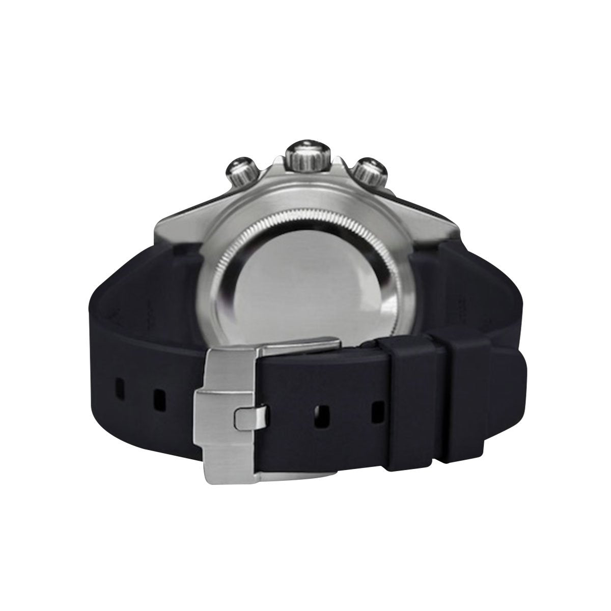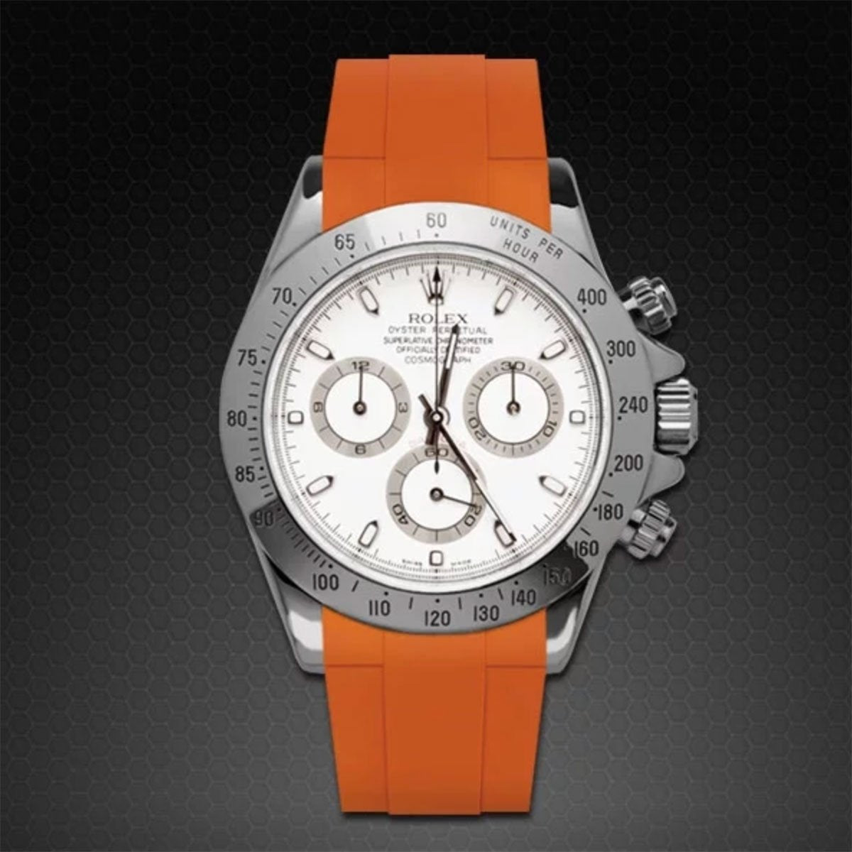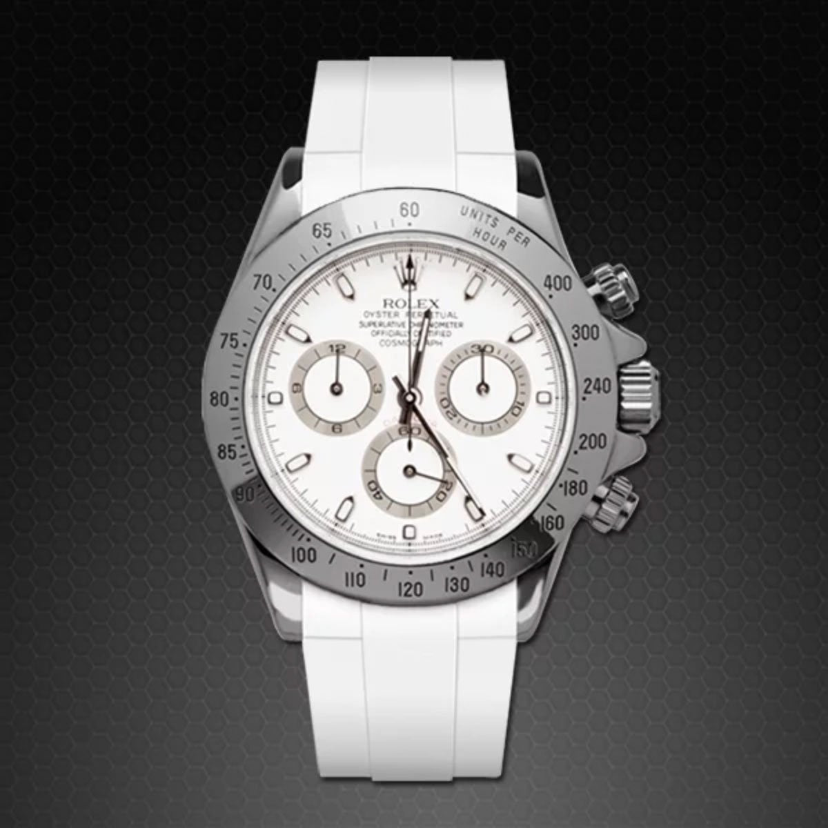 Bracelet en caoutchouc vulcanisé précisément calibré pour s'adapter à la Rolex Daytona (2022 et précédentes) sur bracelet Oyster en acier inoxydable, bicolore ou en or jaune (voir notes). Ce bracelet utilise la technologie « Blocked Integration », incorporant des inserts solides pour un montage impeccable et immobile sur le boîtier de la Daytona*.