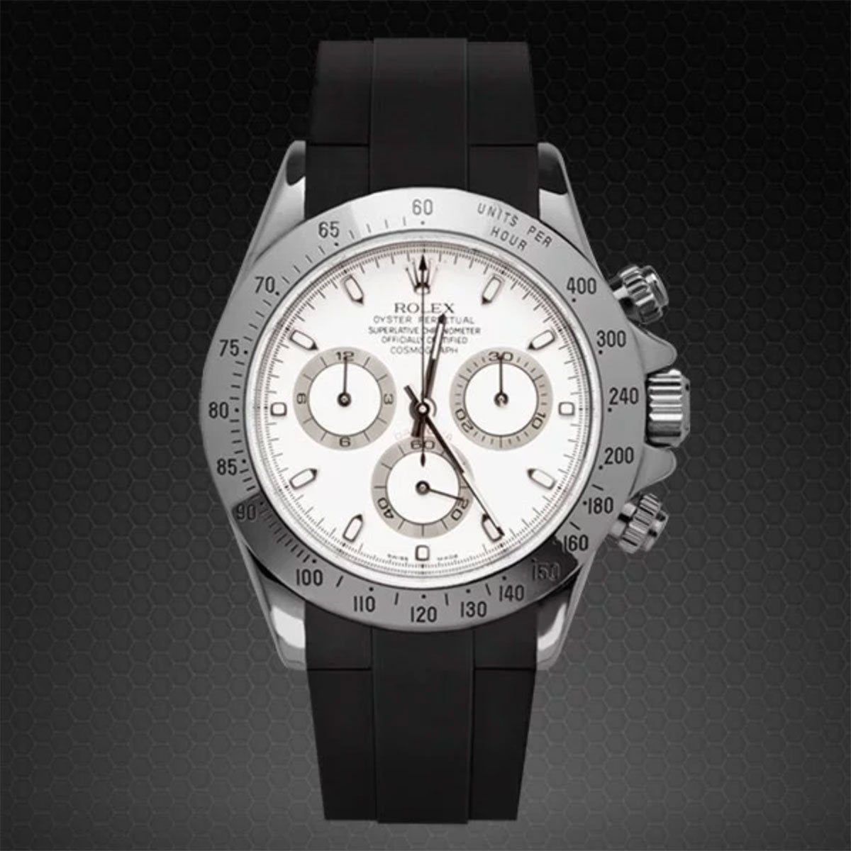 Bracelet en caoutchouc vulcanisé précisément calibré pour s'adapter à la Rolex Daytona (2022 et précédentes) sur bracelet Oyster en acier inoxydable, bicolore ou en or jaune (voir notes). Ce bracelet utilise la technologie « Blocked Integration », incorporant des inserts solides pour un montage affleurant sans défaut et sans mouvement sur le boîtier de la Daytona*. La fermeture exclusive Velcro® Alfatex® assure un ajustement confortable et esthétique.