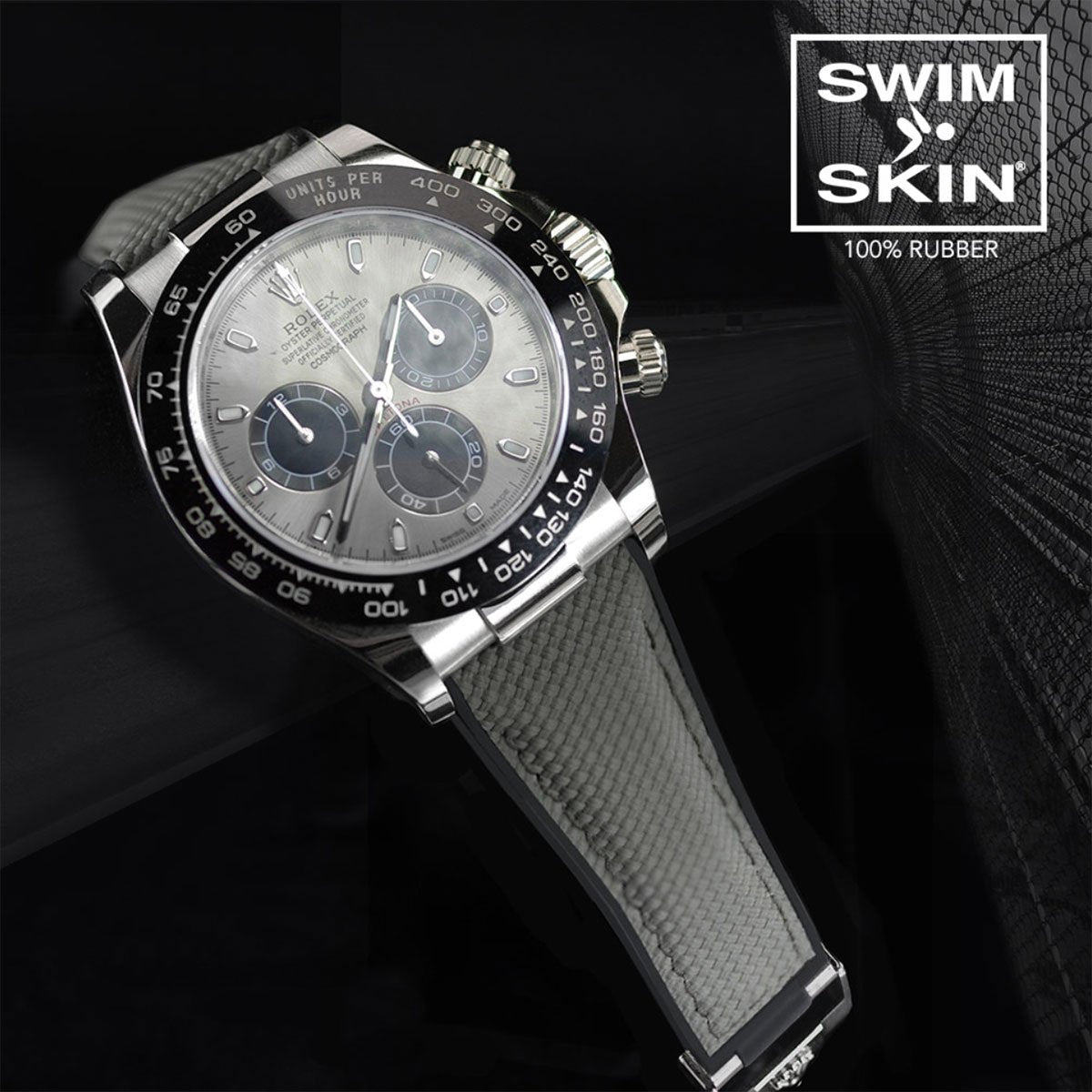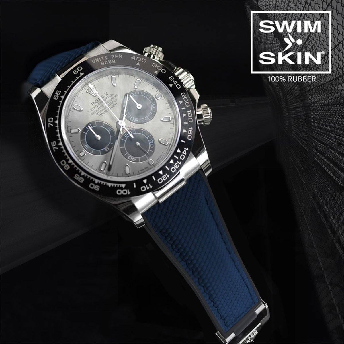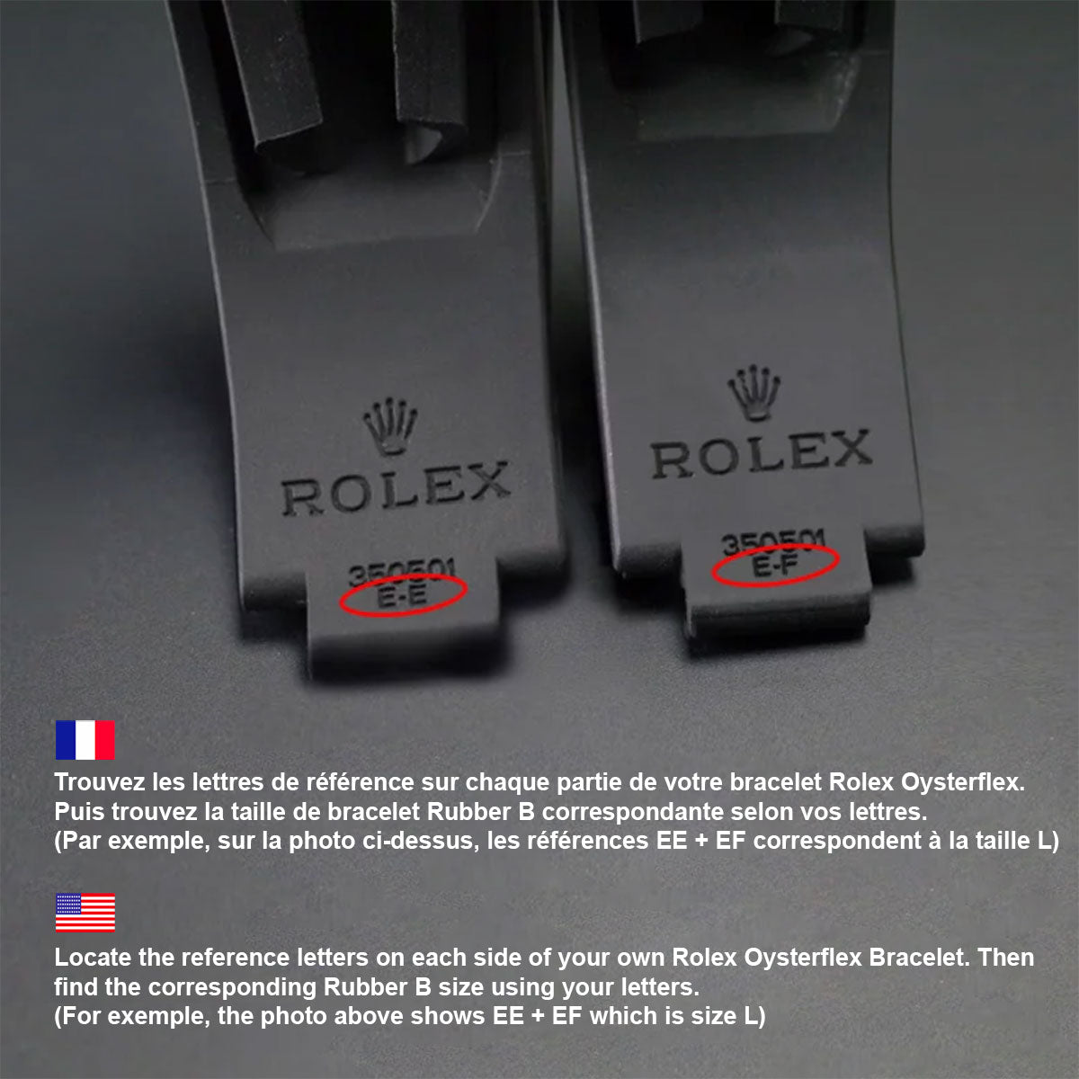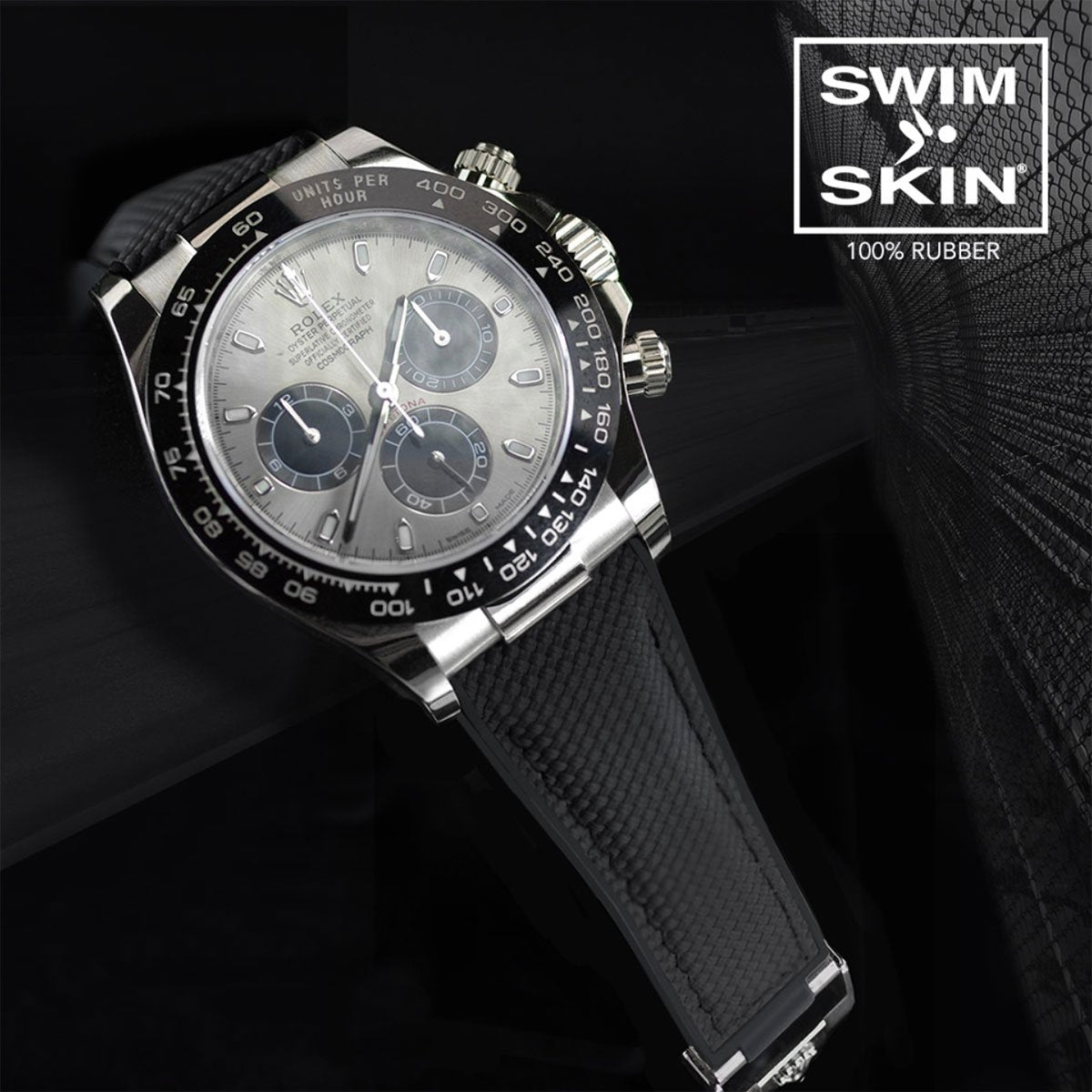 Ce bracelet en caoutchouc veritable vulcanisé est spécifiquement conçu et calibré pour les boîtiers Rolex Daytona munis du bracelet Oysterflex et leurs boucles déployantes*. Fait en "SwimSkin®"; notre technologie de caoutchouc exclusive innovative et breveté.
