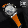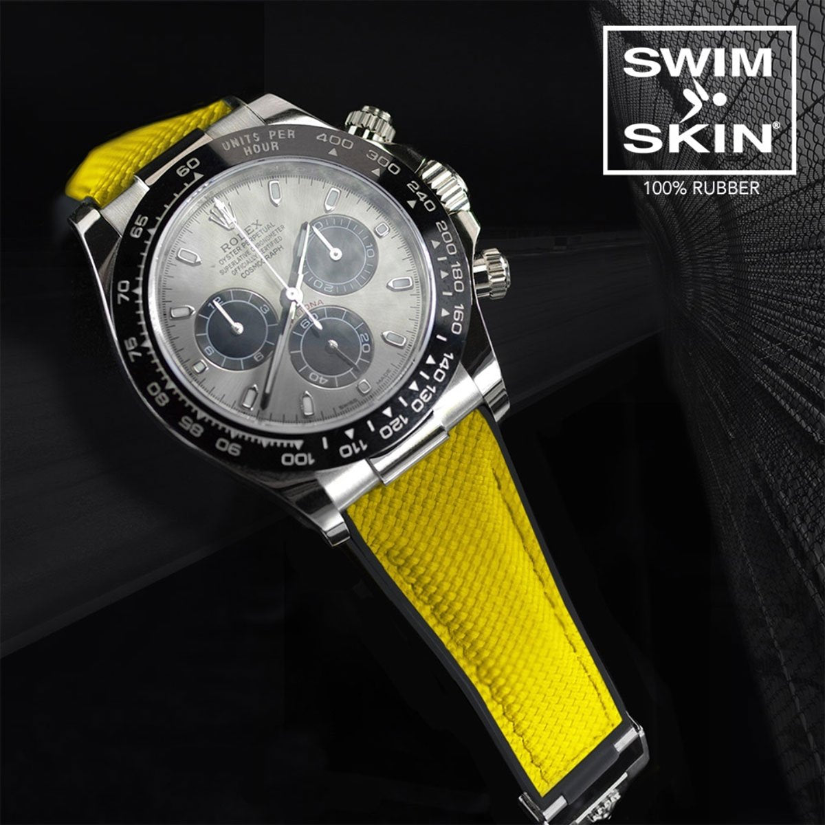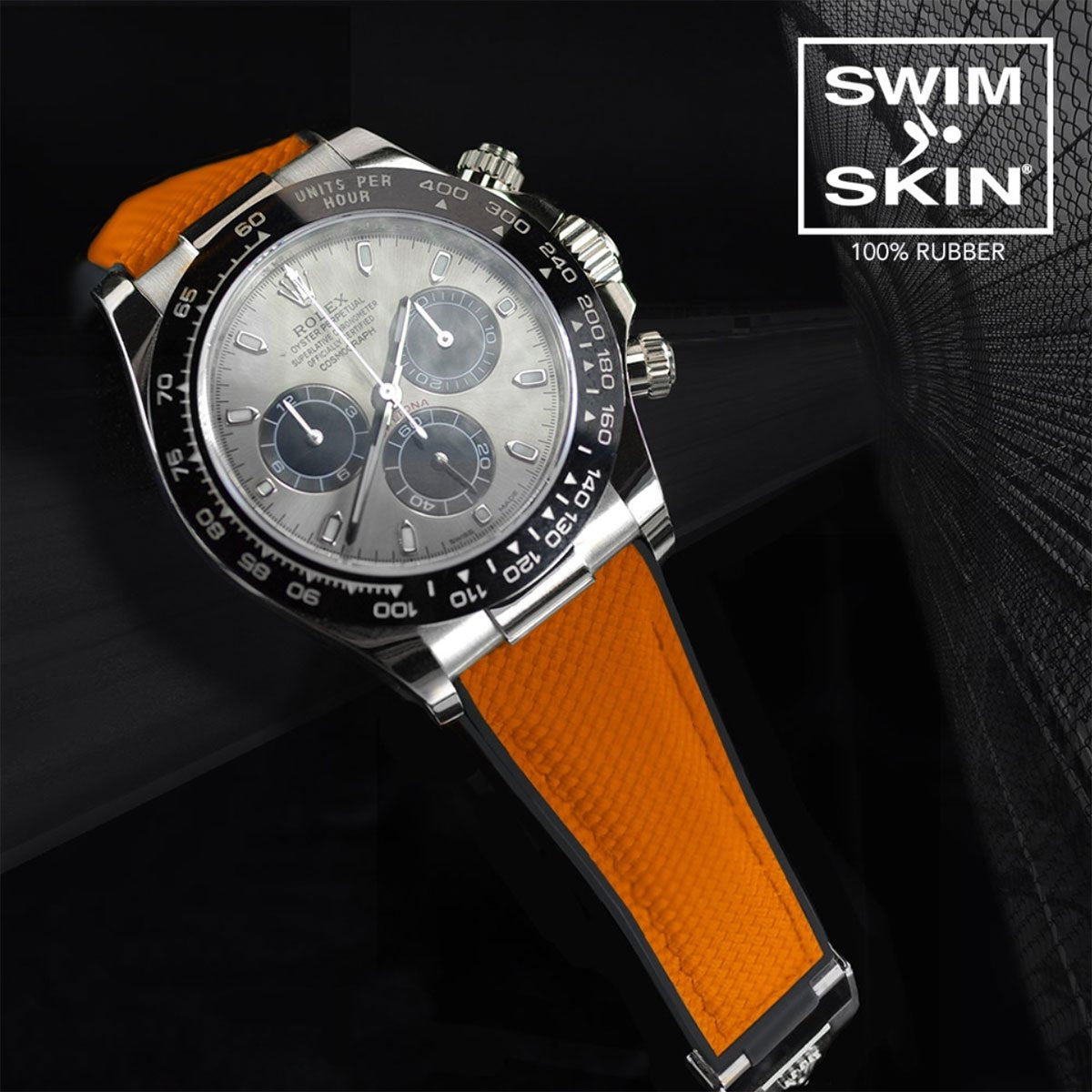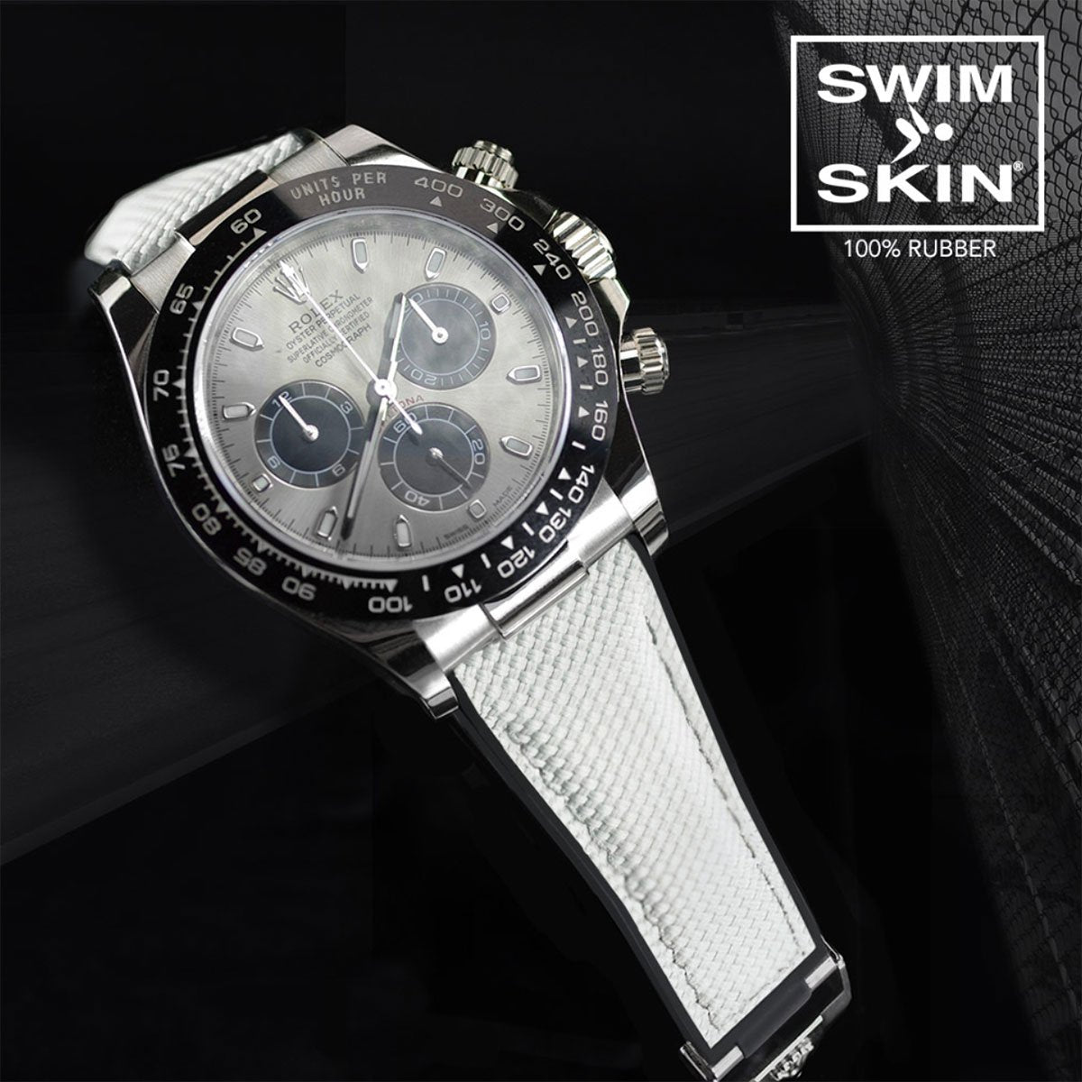 Ce bracelet en caoutchouc veritable vulcanisé est spécifiquement conçu et calibré pour les boîtiers Rolex Daytona munis du bracelet Oysterflex et leurs boucles déployantes*. Fait en "SwimSkin®"; notre technologie de caoutchouc exclusive innovative et breveté.