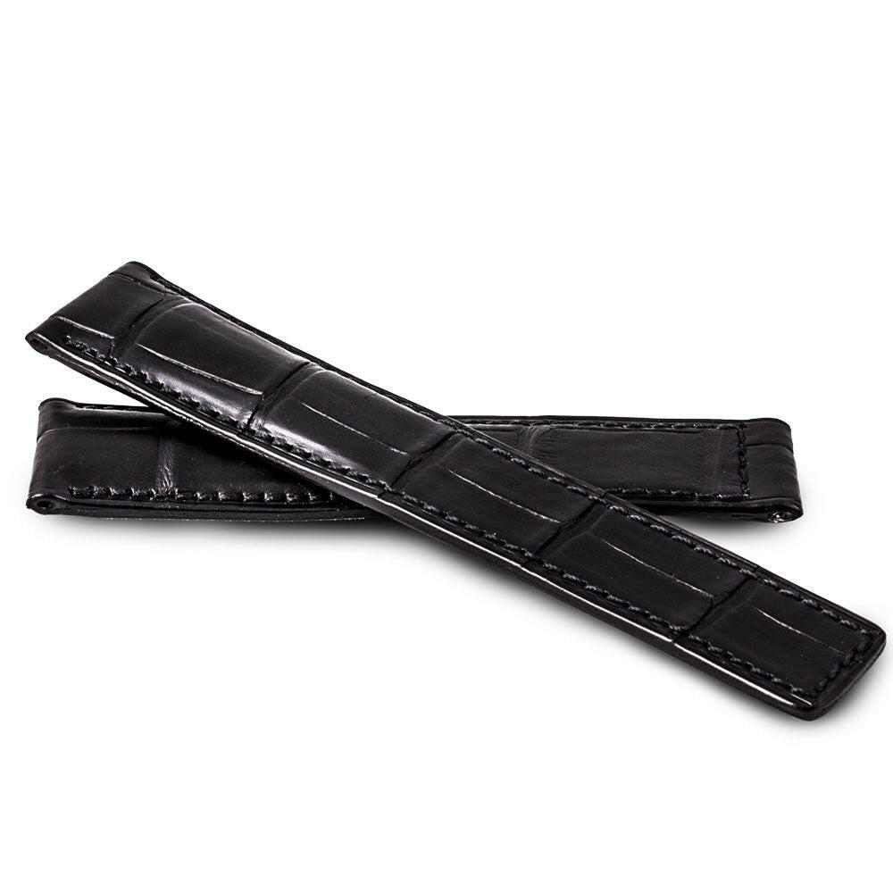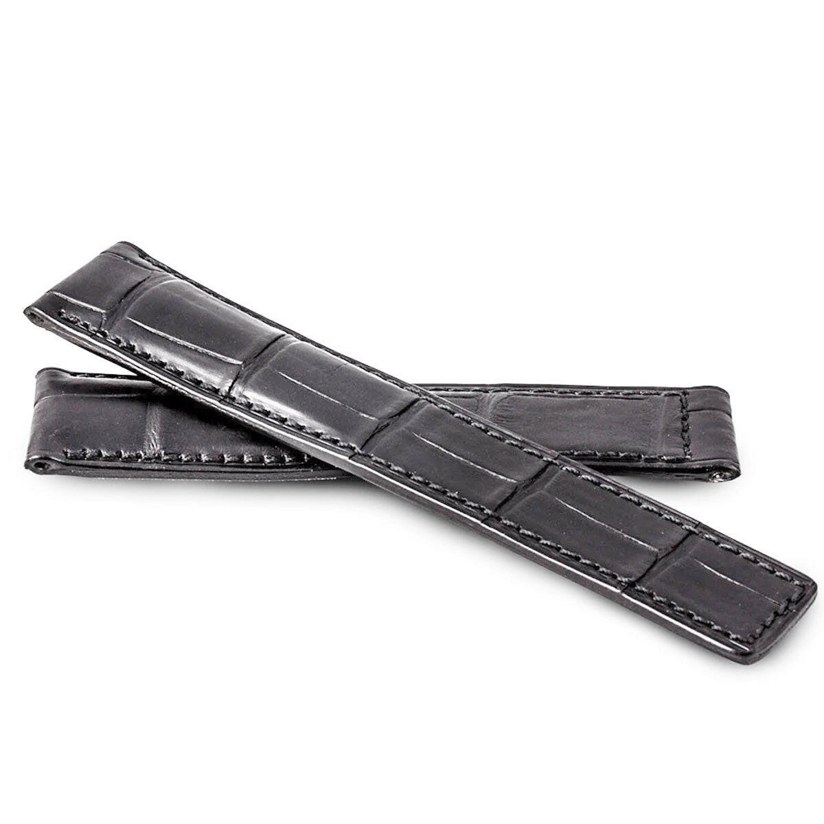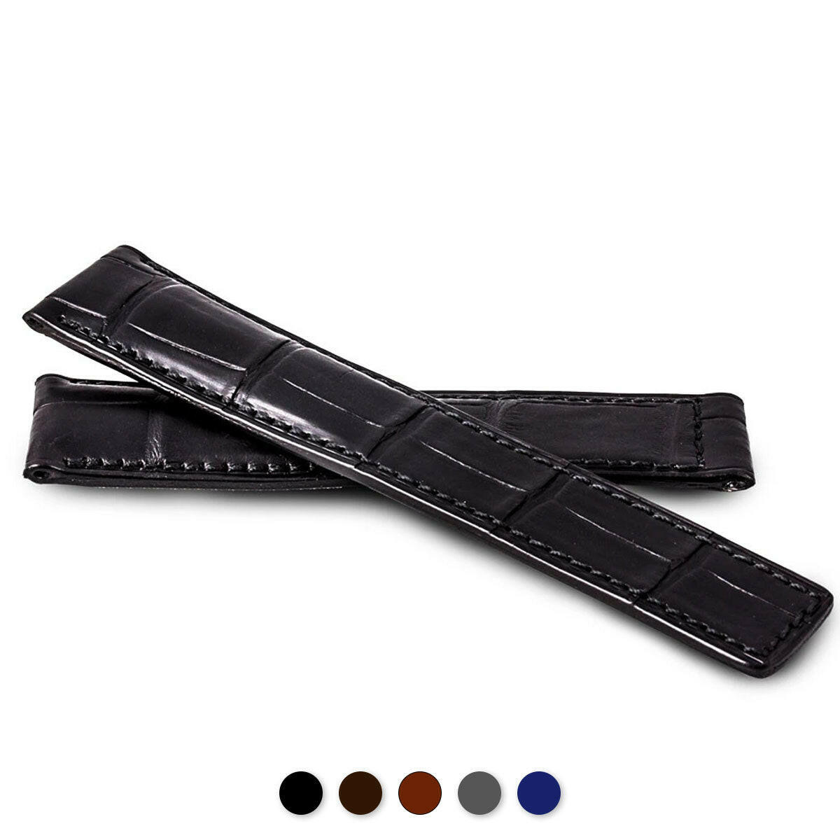 Bracelet de montre Made in France en cuir d’alligator véritable pour montres Breitling. Couture ton sur ton. Epaisseur bombé 5mm, doublure en veau caoutchouté noir.