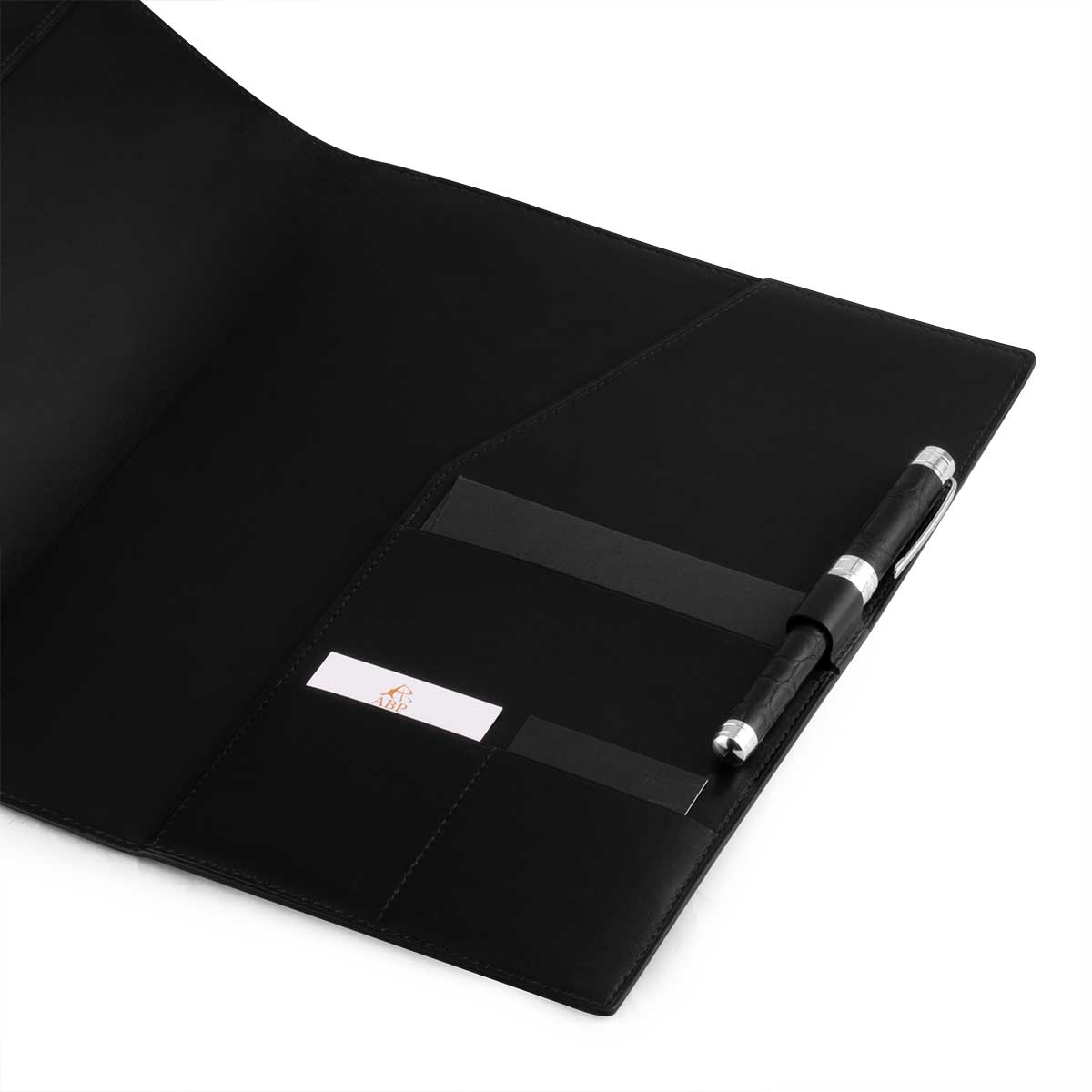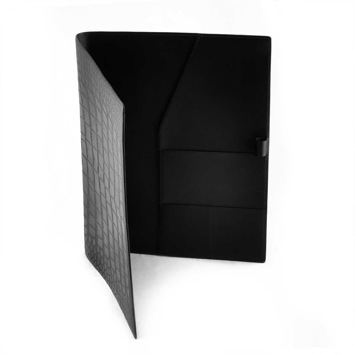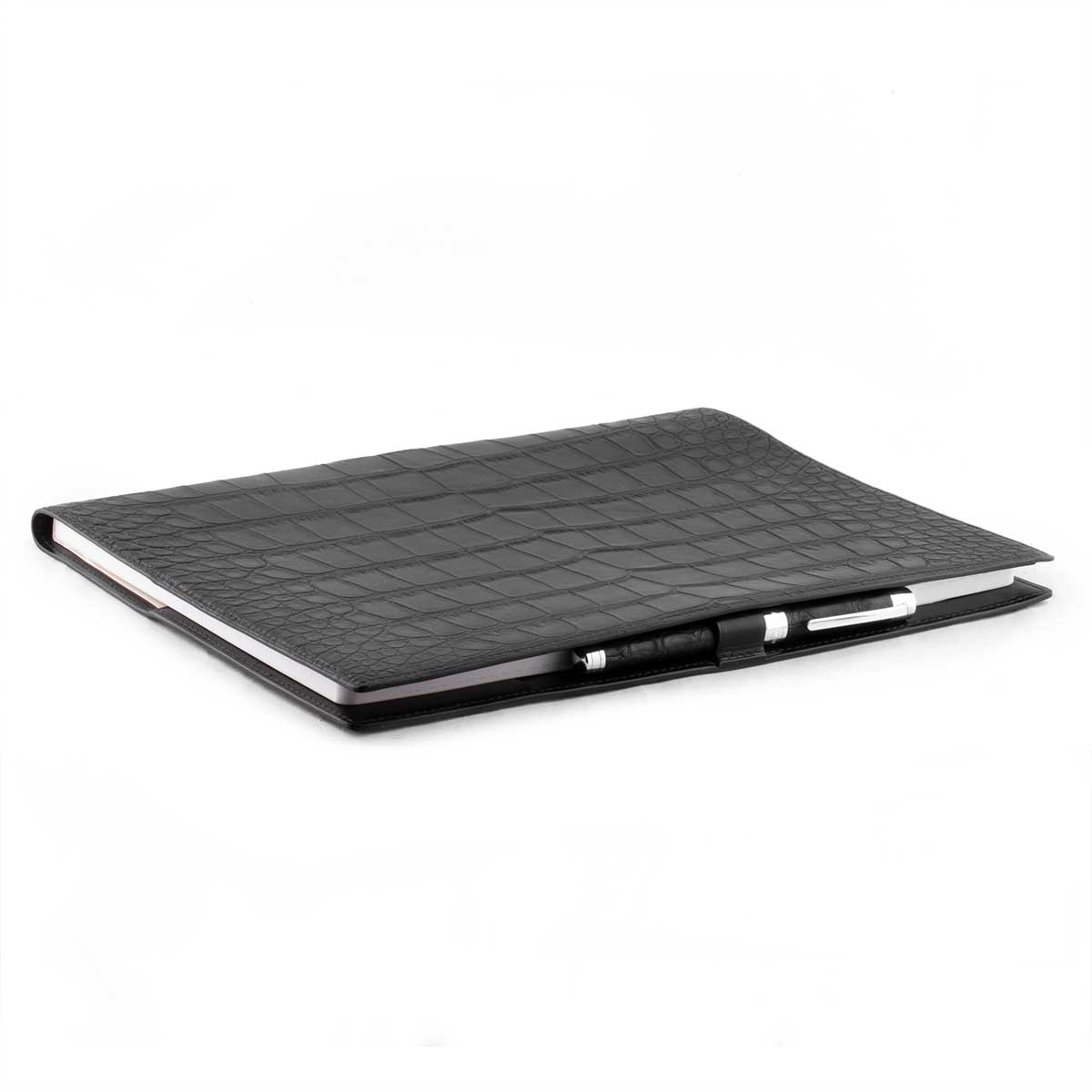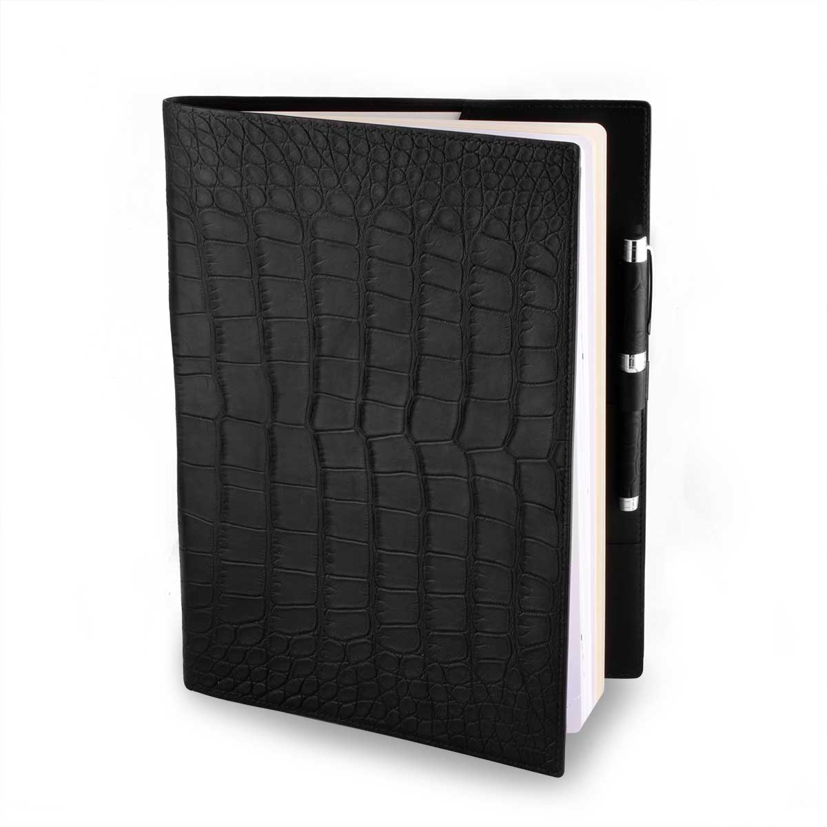 Couverture pour agenda et cahier en cuir d'alligator noir, doublure intérieure en cuir de veau lisse noir.