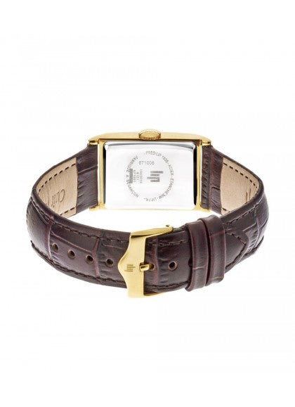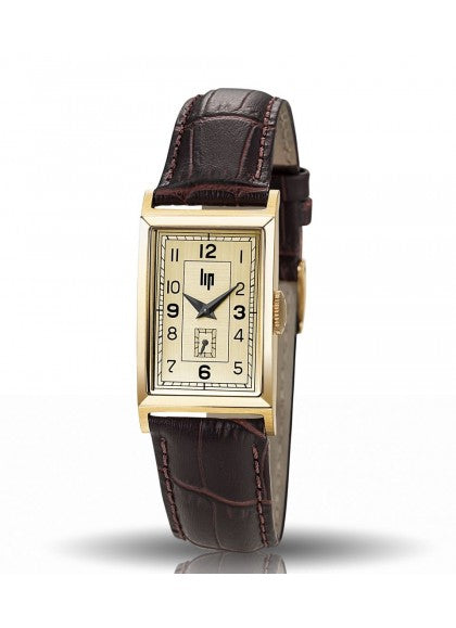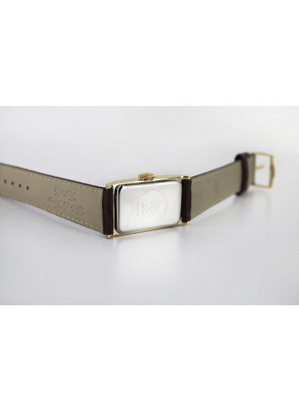 acier 316 L doré, dimensions 39 mm x 21 mm, épaisseur (verre inclus) 8.31 mm, fond acier
