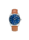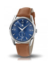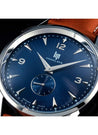 bleu foncé soleillé avec index bâton et chiffres arabes argentés en relief, aiguilles heures et minutes argentées lumineuses, seconde argentée excentrée à 6 H