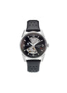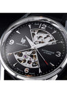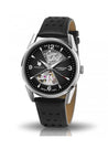 noir avec index chiffres arabes et bâtons argentés, aiguilles heure et minute argentées lumineuses, trotteuse argentée