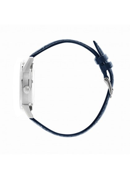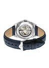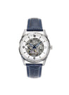 argenté avec index bâtons et chiffres arabes argentés en relief, aiguilles bleu nuit, "squelette" mécanisme apparent