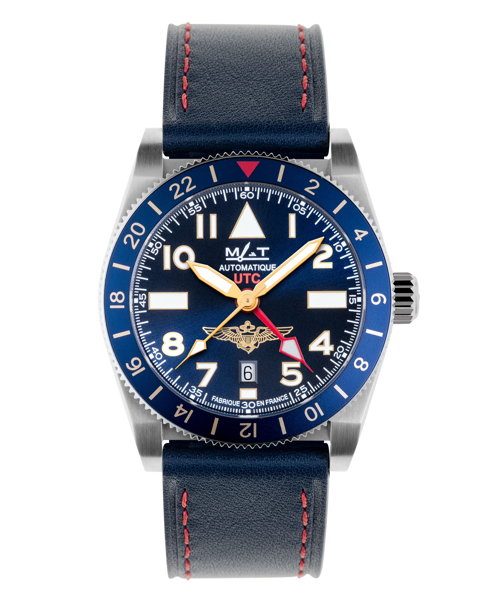 Dans son boitier ultra-résistant de 42.5mm, le cadran bleu nuit soleillé arbore les ailes de pilote et s’équipe d’index et chiffres arabes en Superluminova BGW9 (Blue Glow White).