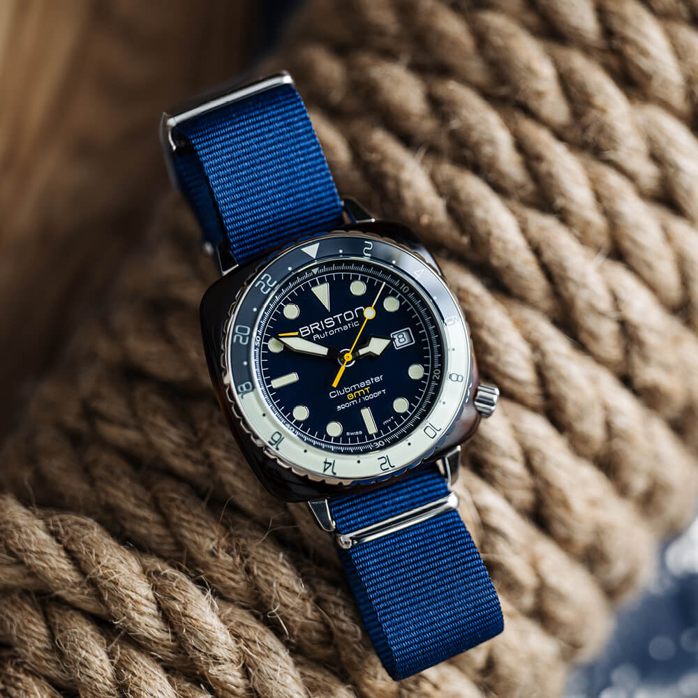 Pour les amateurs de grandes profondeurs et de voyage, Briston propose cette montre équipée d’un mouvement automatique suisse : la Clubmaster Diver Pro GMT.
