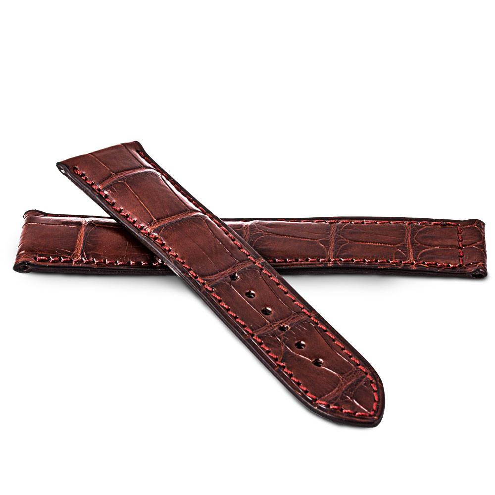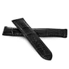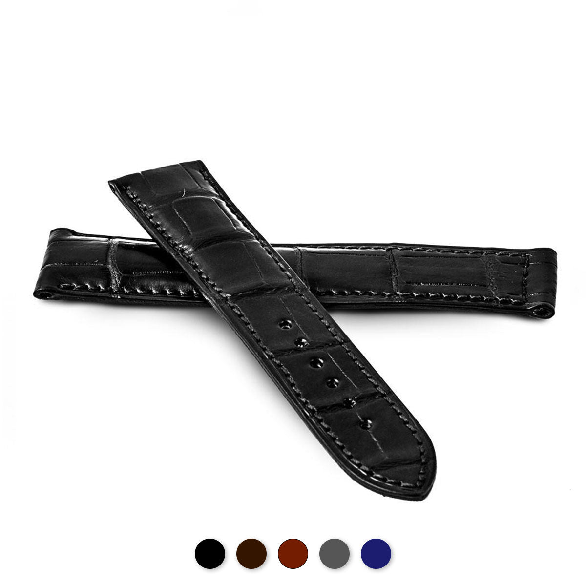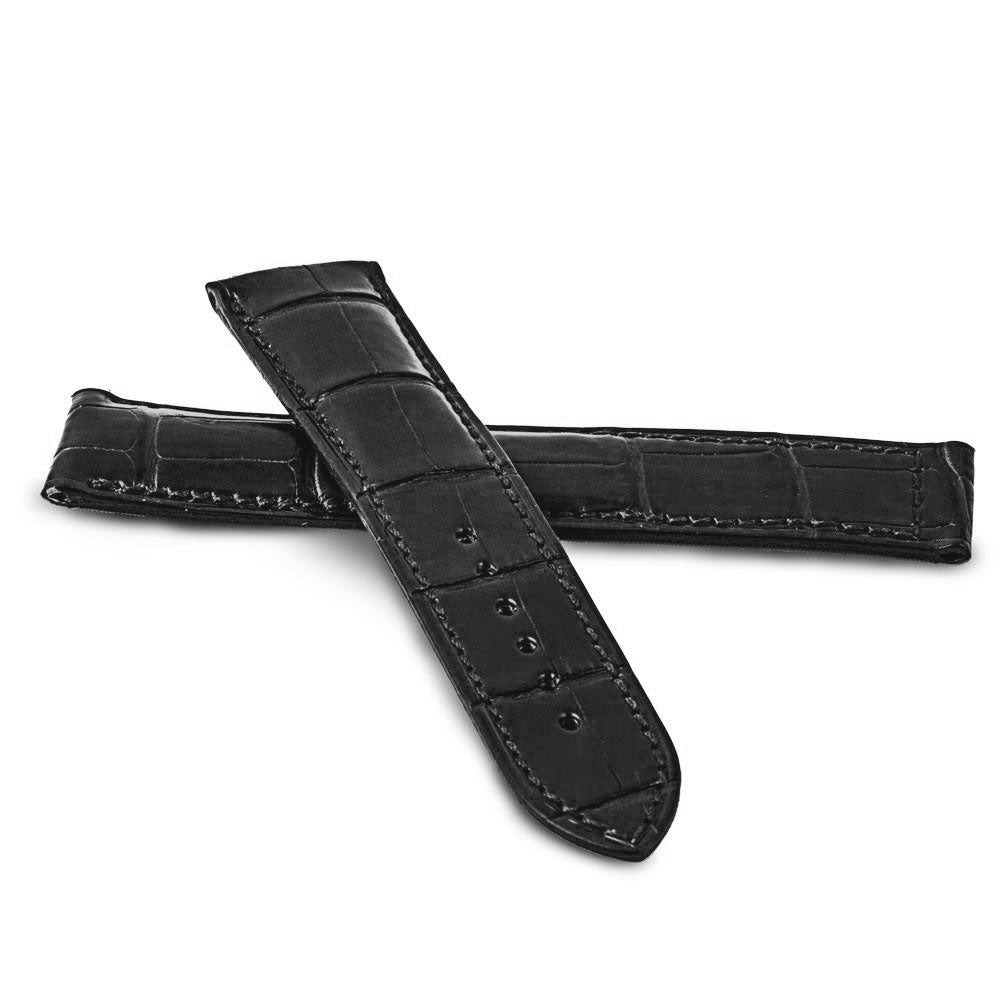 Bracelet de montre en cuir d’alligator véritable pour montres Omega. Couture ton sur ton, épaisseur 5mm, doublure en veau caoutchouté noir.