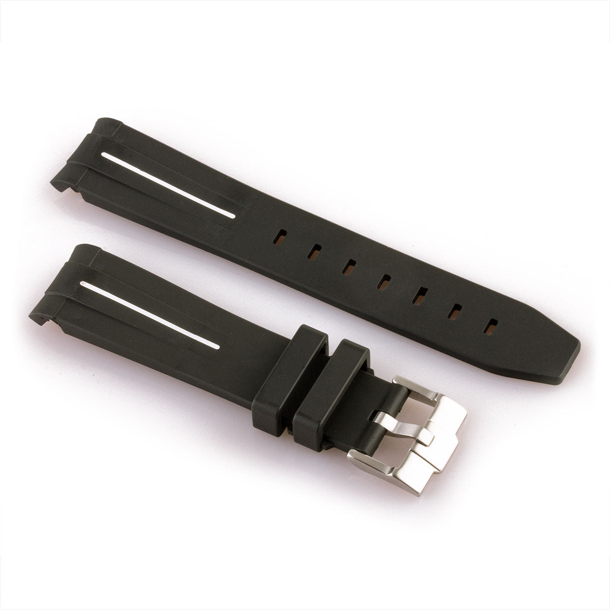 Bracelet-montre rubber intégré en caoutchouc water resistant FKM, plus résistant que le caoutchouc classique. Ce bracelet est conçu pour s'adapter aux montres Rolex d'entrecorne 20mm, 21mm et 22mm : Oyster Perpetual, Oyster Perpetual Date, GMT Master, GMT Master II, Daytona, Sea Dweller, Explorer I, Explorer II, Milgauss, Yachtmaster, Airking, Datejust...
