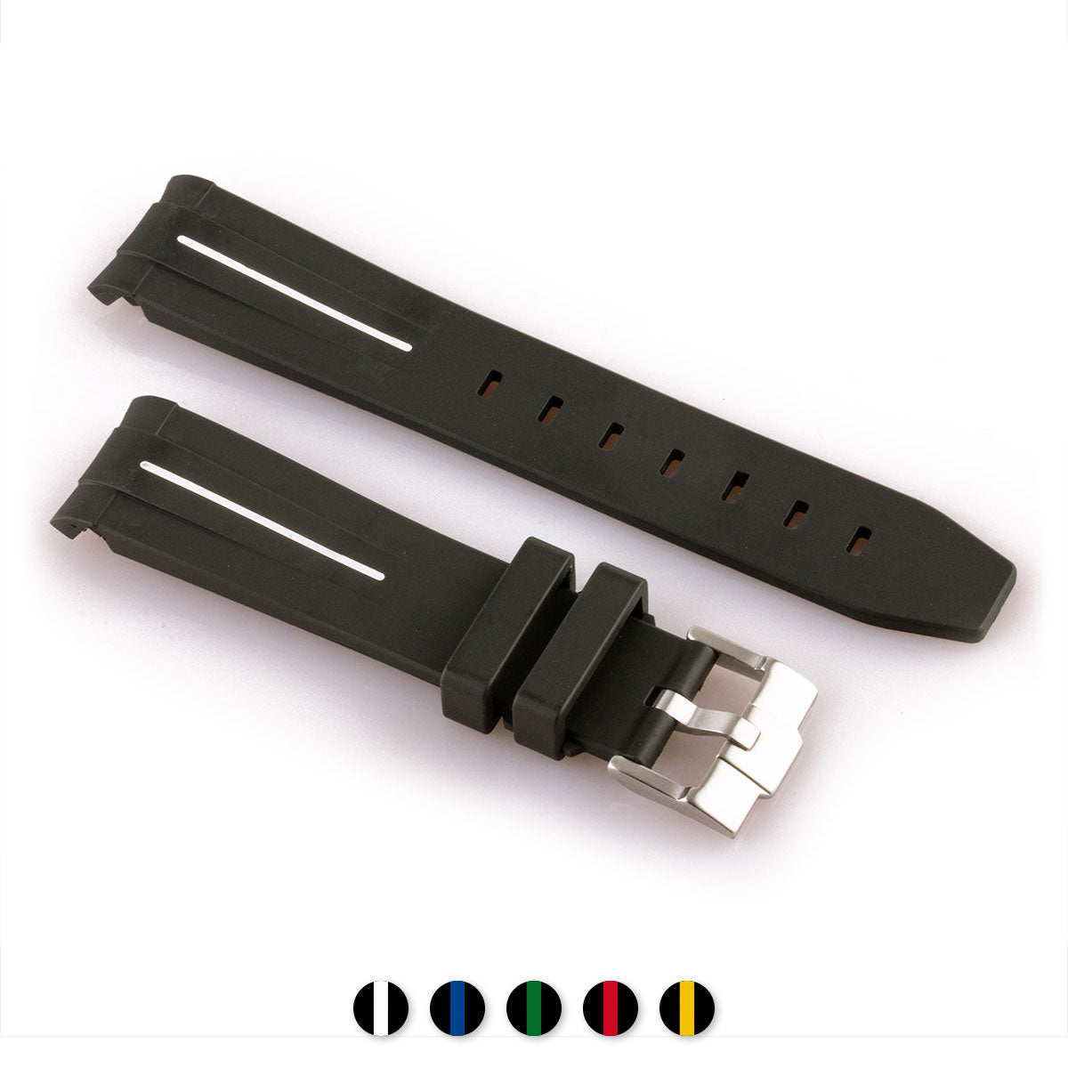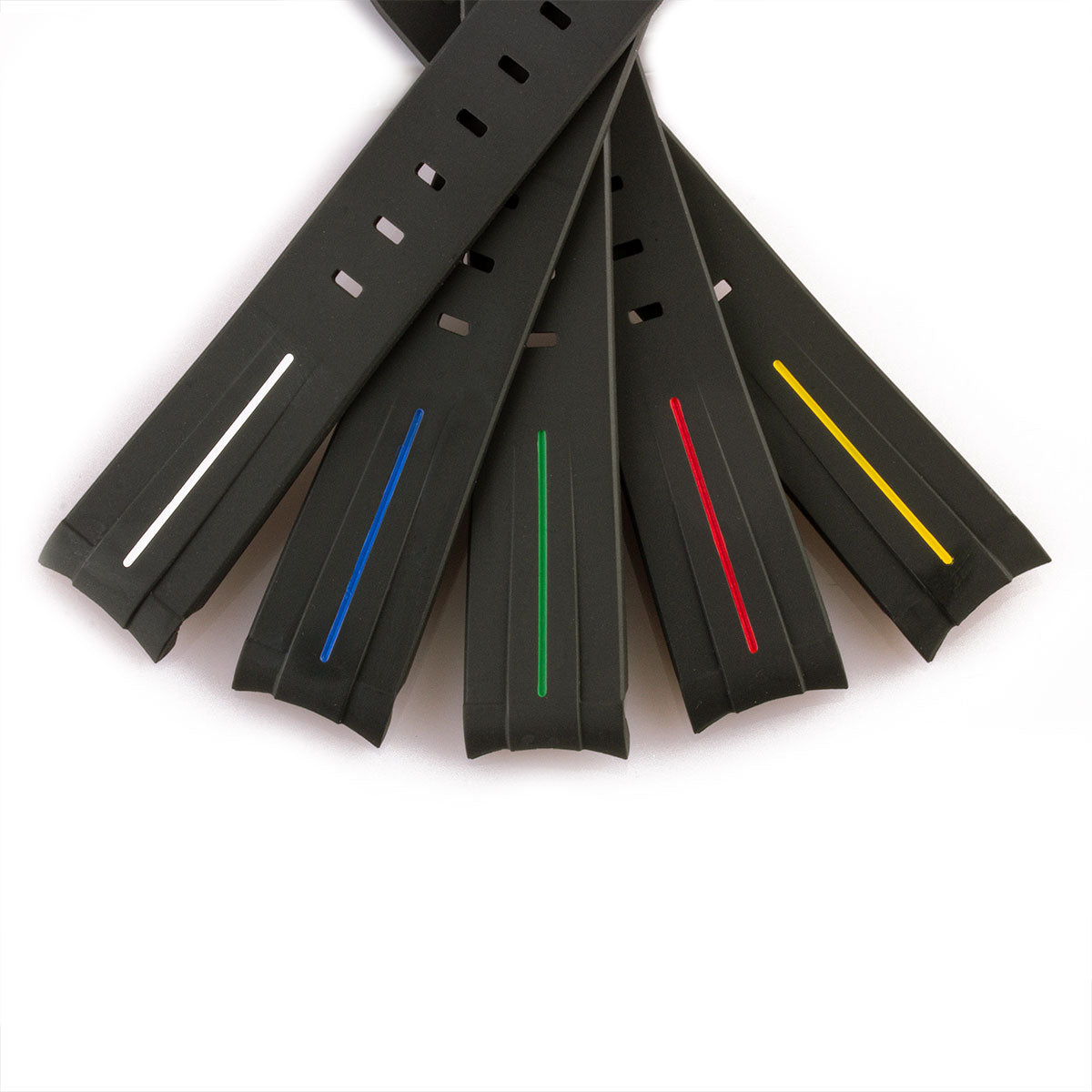 Rolex – Bracelet montre intégré caoutchouc FKM avec boucle ardillon – Rubber noir à rayure (blanc, bleu, vert, rouge, jaune)