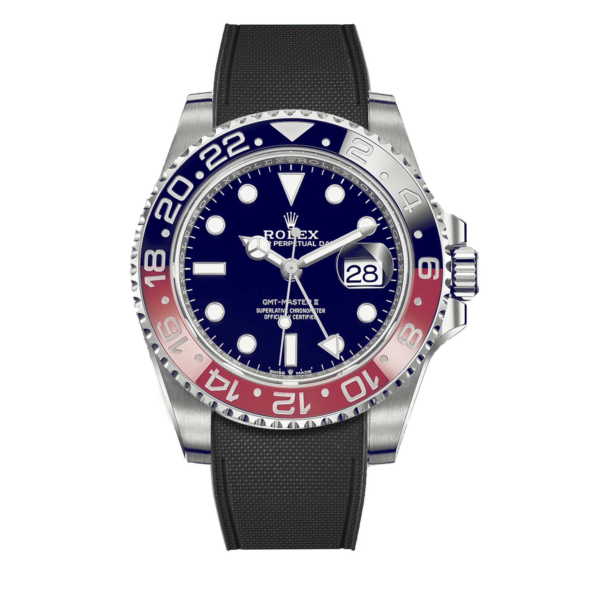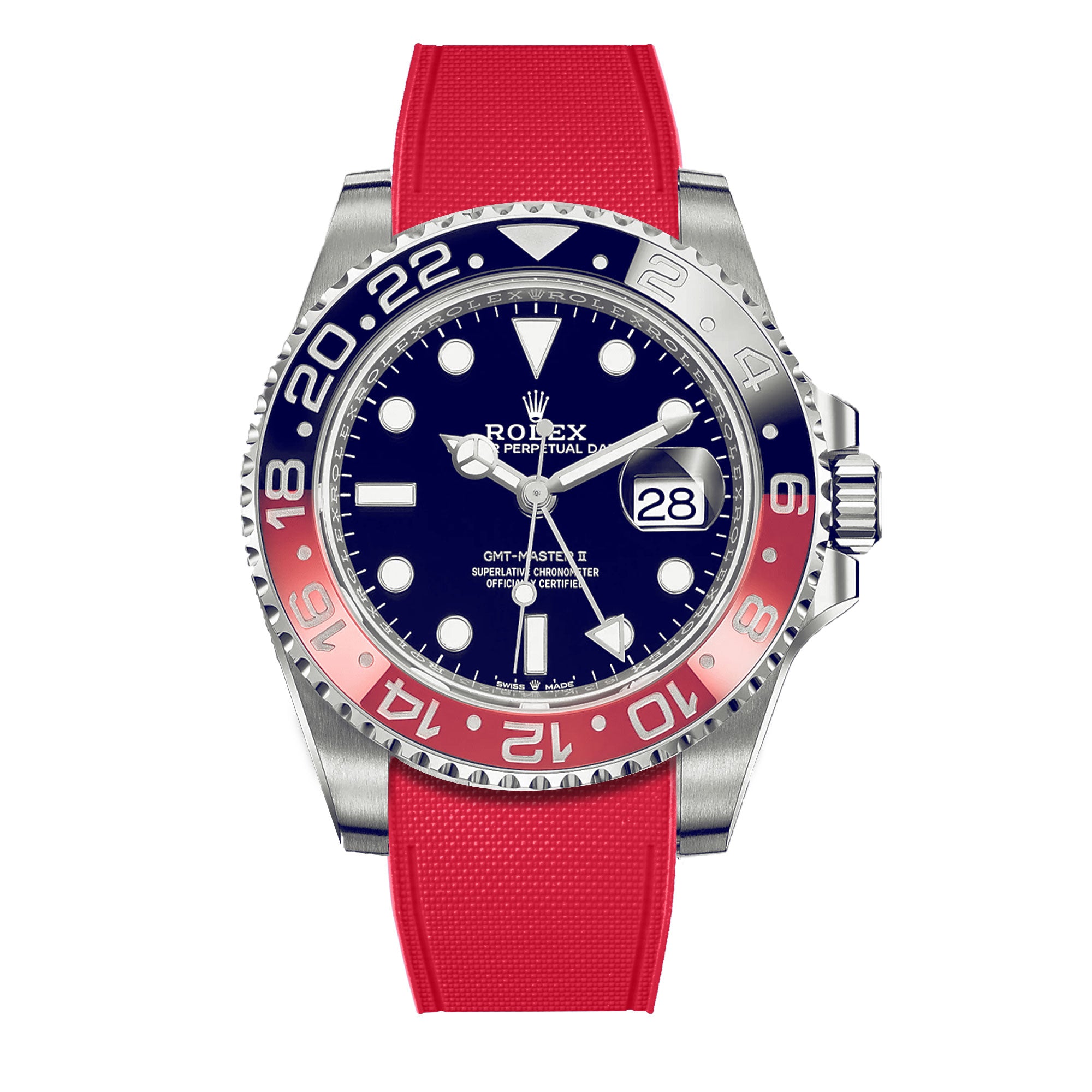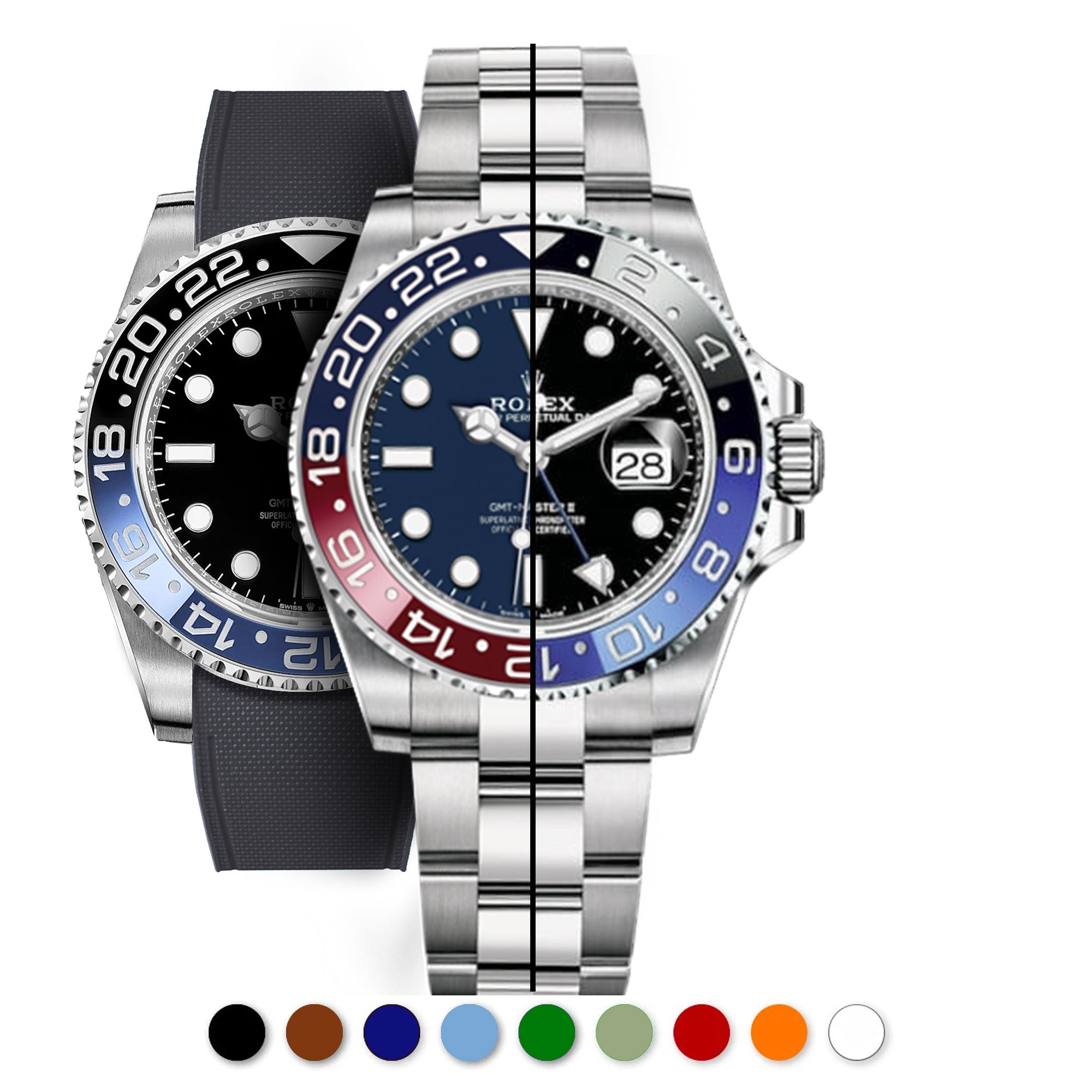 Bracelet-montre rubber intégré « R Strap » en caoutchouc haute densité, hypoallergénique, anti transpiration, étanche, spécialement conçu et étudié pour s'intégrer à la carrure de votre montre Rolex GMT Master II et son bracelet Oyster