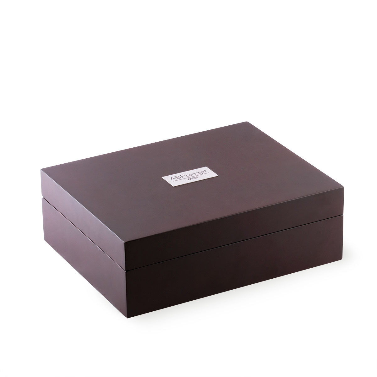 Wooden outside, grey velvet inside, black velvet bottom, magnetic locking system.