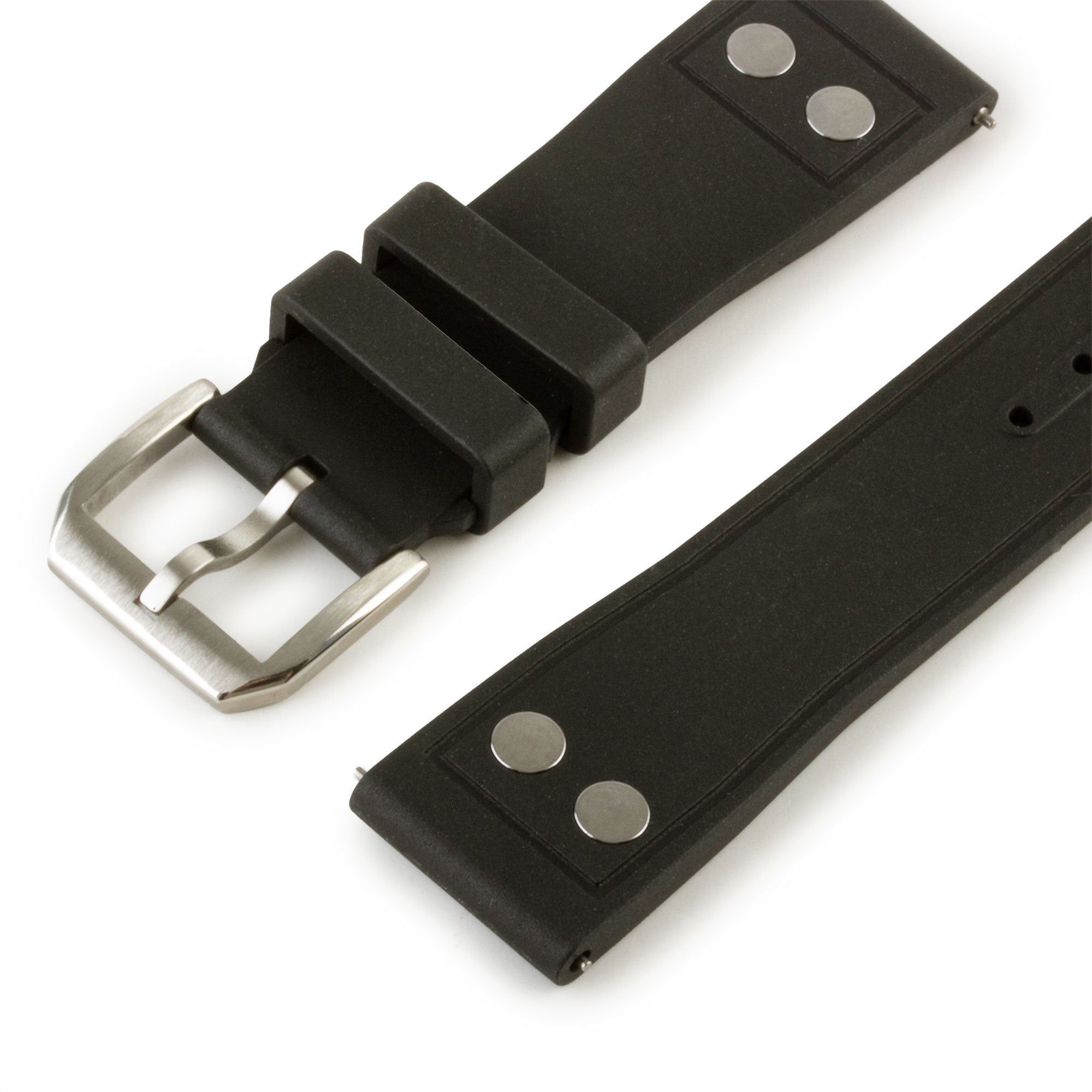 Pilot style rubber watch strap with steel rivets, sold equipped with quick release lug bars. IWC type brushed steel buckle.