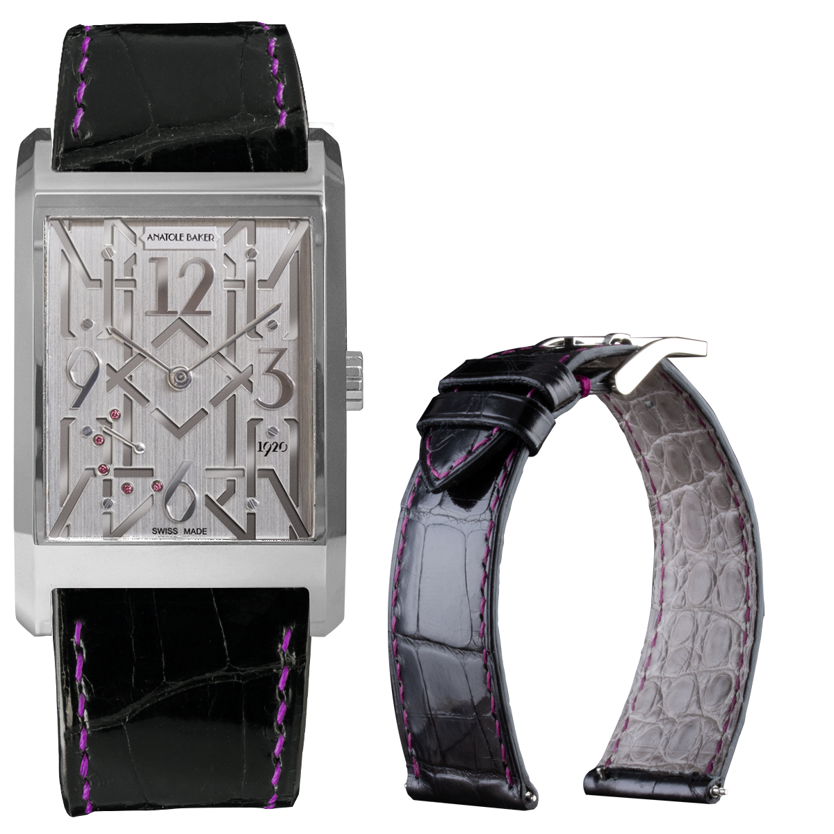 Leather watch band - Anatole Baker - Glossy black alligator with pink stiching