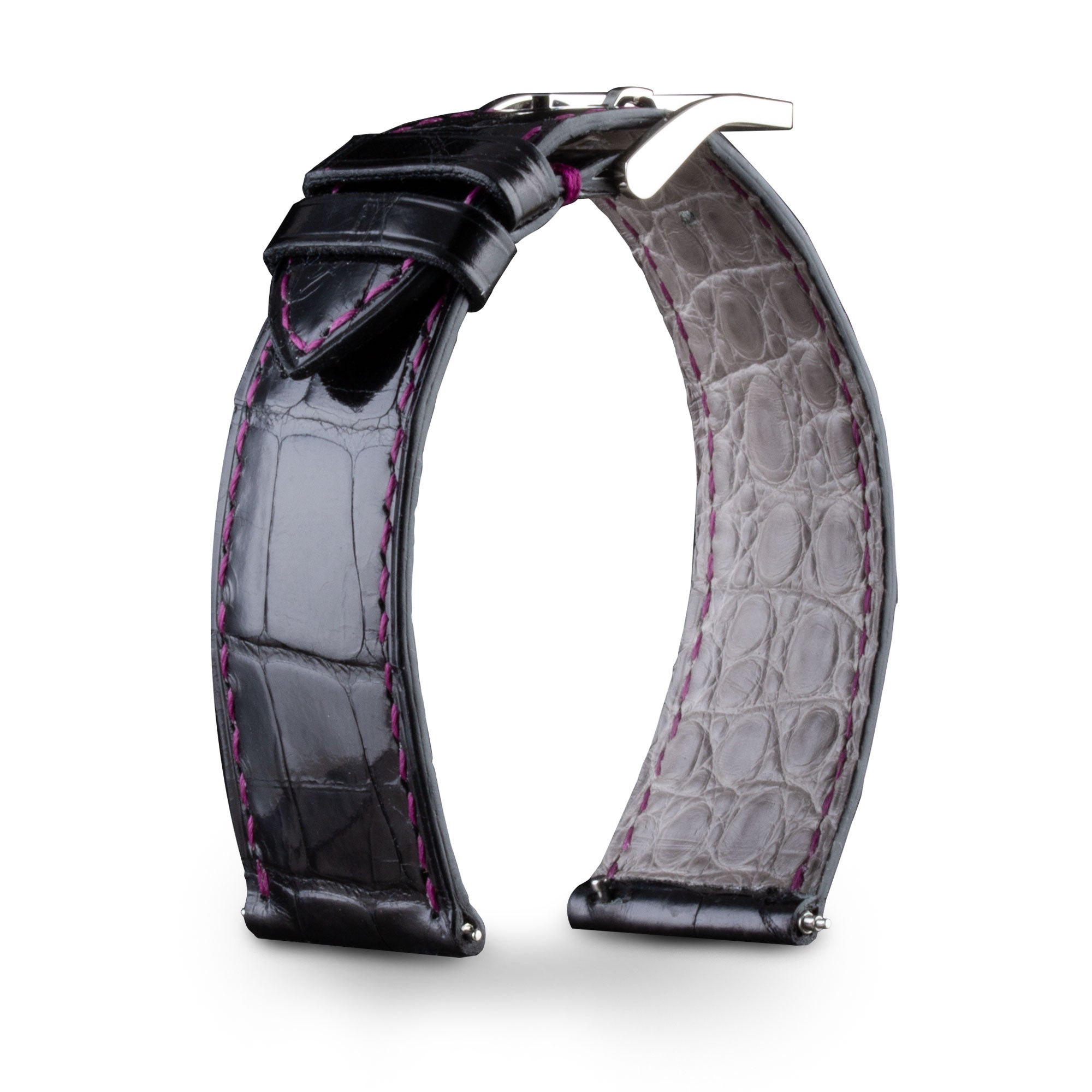 Genuine glossy black alligator leather watch strap. Grey rounded scales alligator lining. 2mm (0.08 inch) flat thickness at the watch, pink stitching.