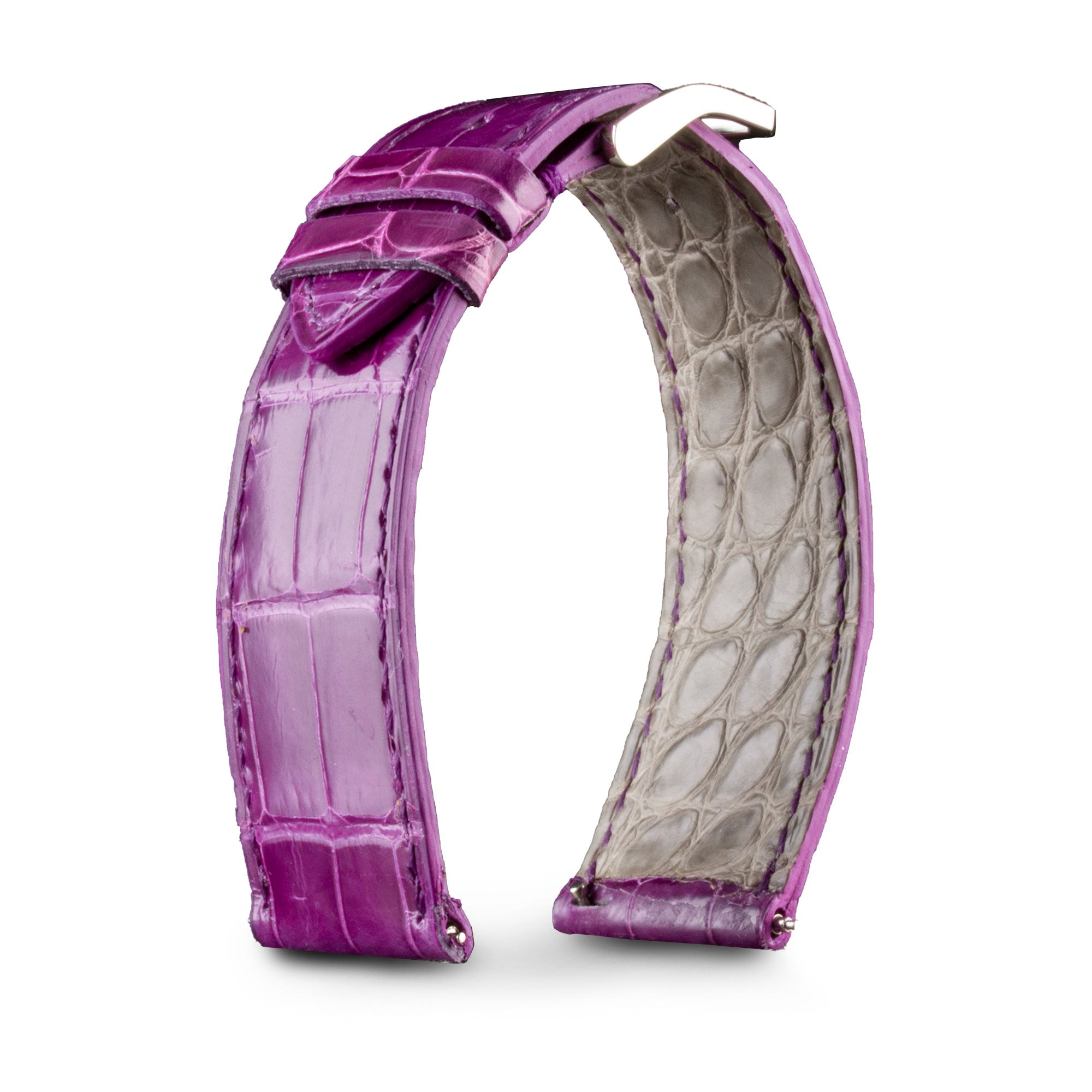 Genuine Pink alligator leather watch strap. Grey rounded scales alligator lining. 2mm (0.08 inch) flat thickness at the watch, Tone on tone Pink stitching.