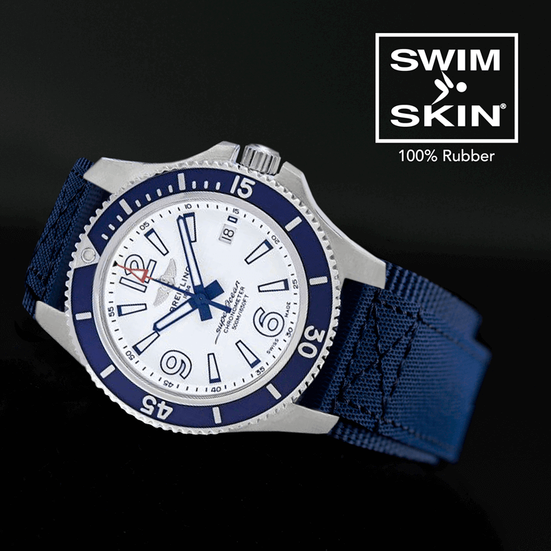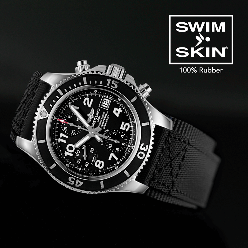 Vulcanized Rubber Strap / Combat Strap for Breitling watches with corresponding lug space of 19-20mm. This high-tech watch band is made of "SwimSkin®", our exclusive patented technology, created over a developmental period of many years, requiring all-new innovative machinery and engineering techniques.