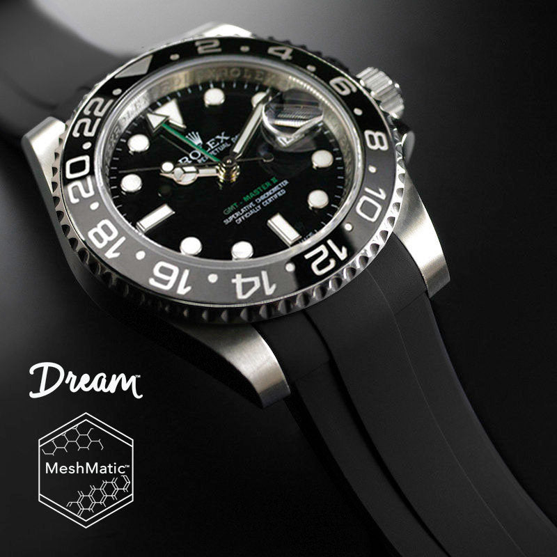 This supple vulanized rubber strap is specifically calibrated to fit all Rolex GMT Master II Ceramic Bezel*. The Dream Strap features our PATENT-PENDING MeshMatic Technology for a perfectly precise and comfortable fit to your wrist. This strap utilizes "Blocked Integration" engineering, incorporating solid inserts for a flawless, motion-free flush mount to the GMT II Ceramic case, and features the Rubber B signature "T" design.