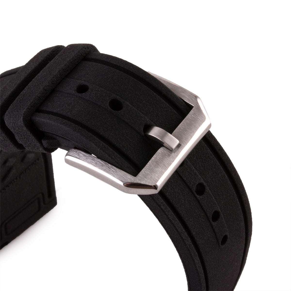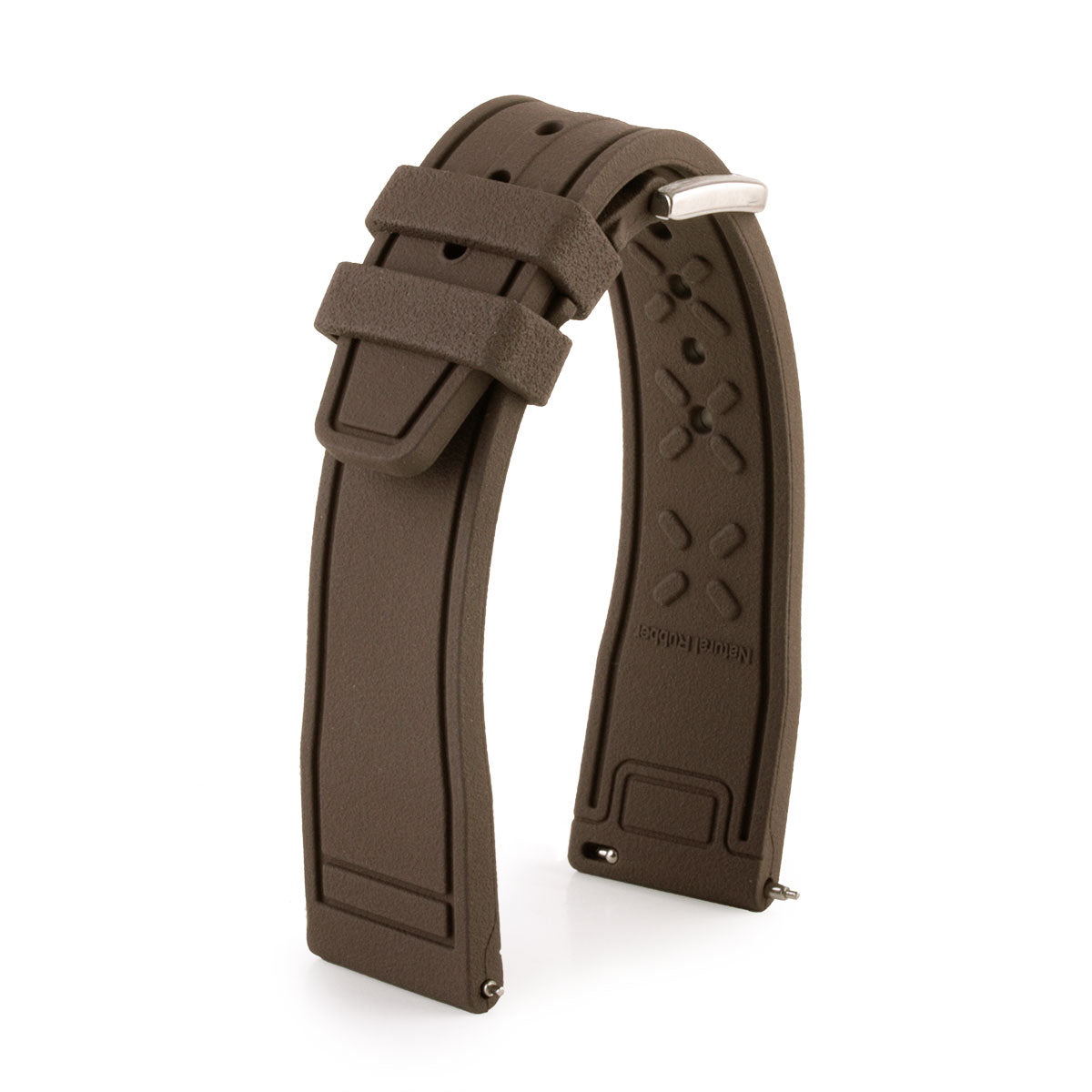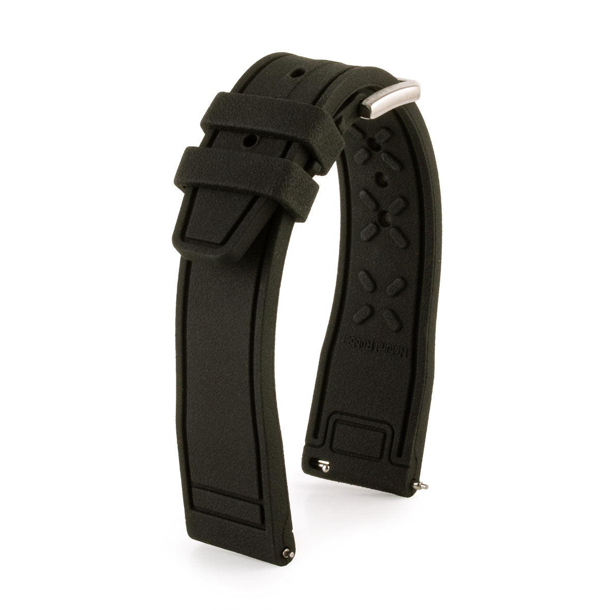 Pilot style rubber watch strap, sold equipped with quick release lug bars. IWC type brushed steel buckle.