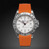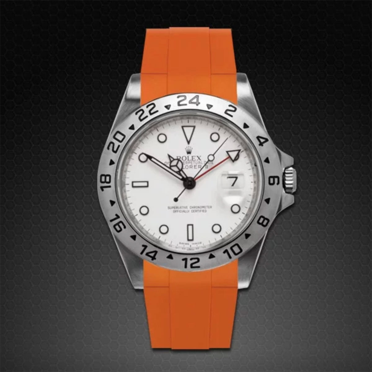 Vulcanized rubber strap which is precisely calibrated to fit the Rolex Explorer II (40mm). This strap utilizes "Blocked Integration" engineering, incorporating solid inserts for a flawless, motionless flush mount to the Explorer II 40mm case*.