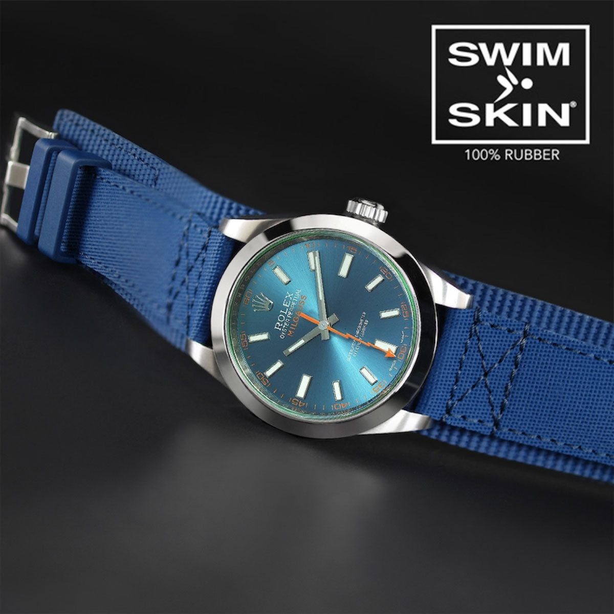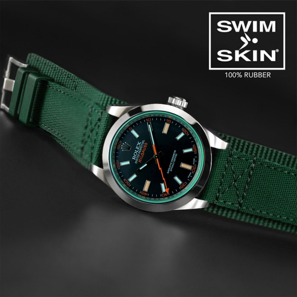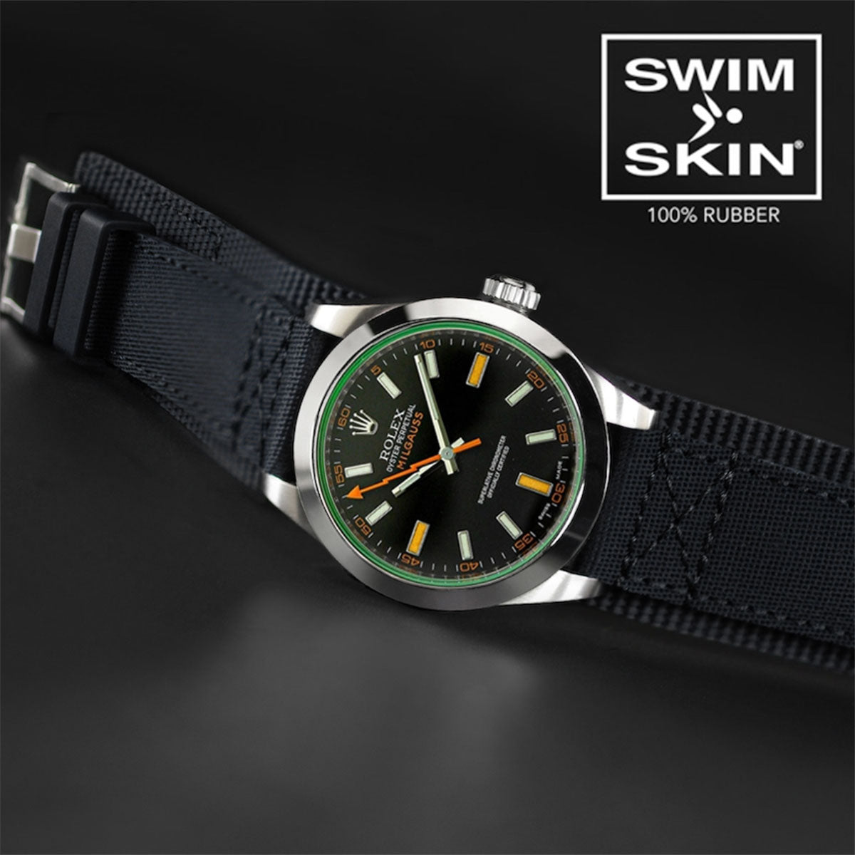 Vulcanized Rubber Tang Buckle Strap for Rolex Milgauss 40mm. This high-tech watch band is made of "SwimSkin®", our exclusive patented technology, created over a developmental period of many years, requiring all-new innovative machinery and engineering techniques.