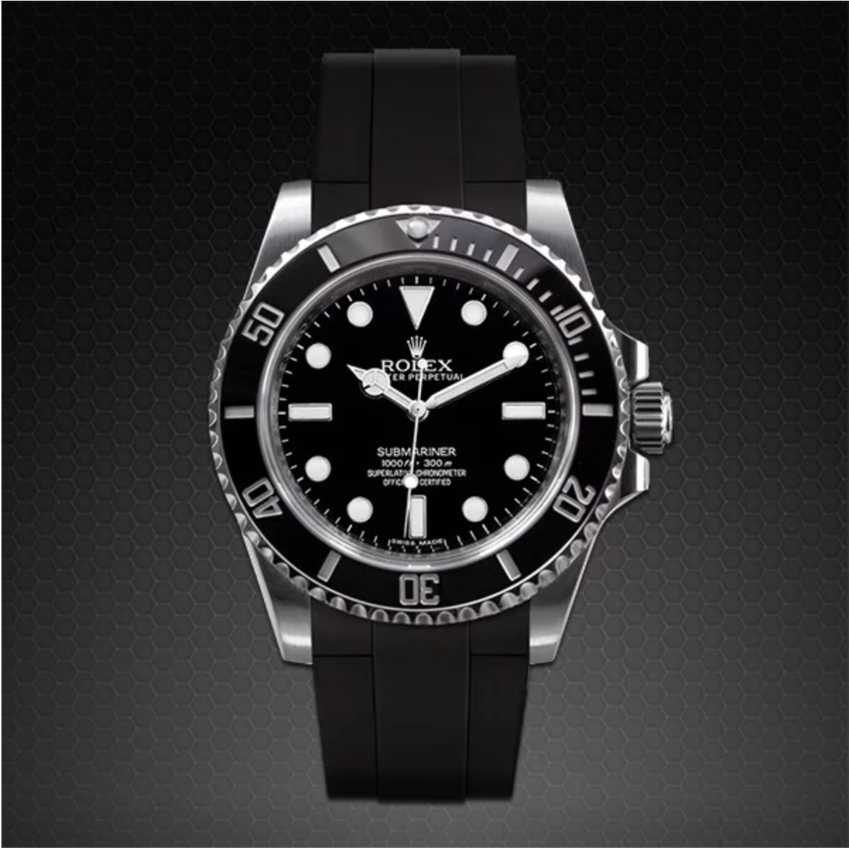 Vulcanized rubber strap engineered to fit Rolex Submariner 40mm Ceramic, featuring a solid insert for Blocked Integration to the watch case. Our exclusive Velcro® Alfatex® closure provides a comfortable and esthetically pleasing mount to the Submariner Cermaic case.