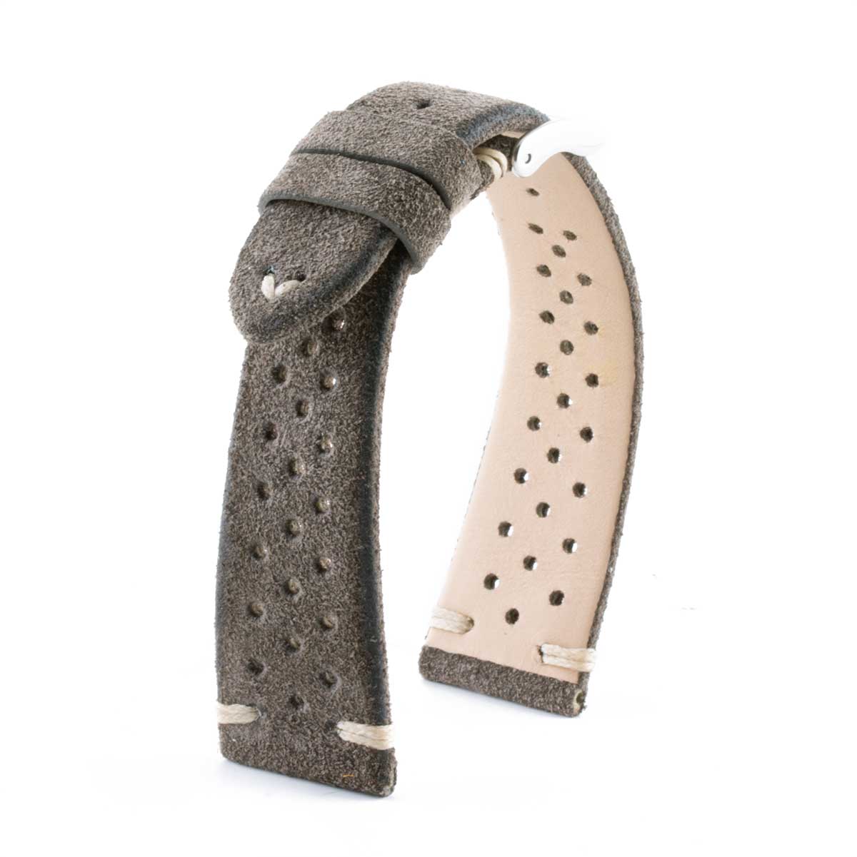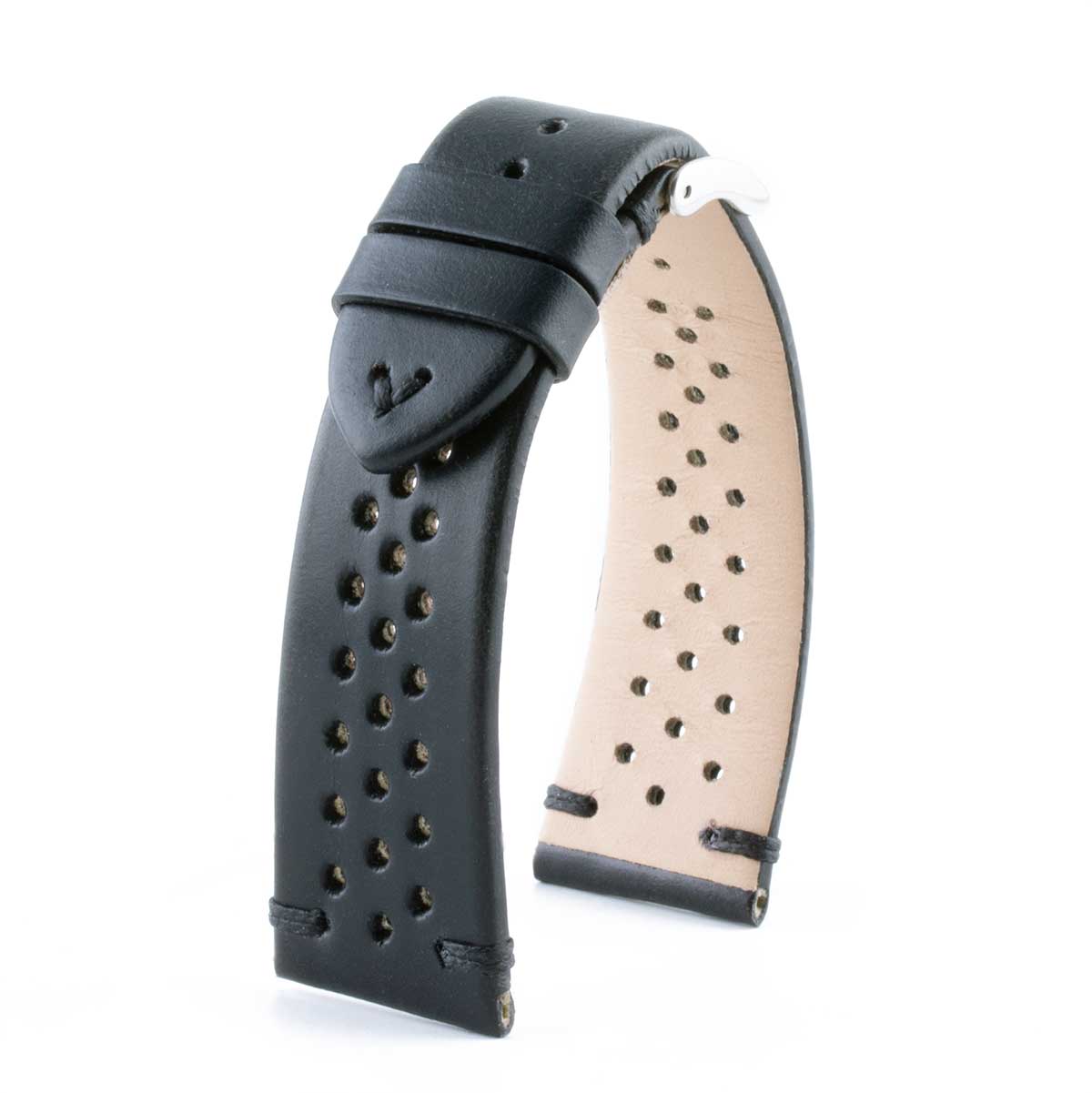 Calf leather watchband. Stop points stitching. Driver sport holes. Classic calf lining. 3mm (0.12 inch) thickness. Available in multiple widths, these watch straps are compatible with multiple watch models.