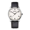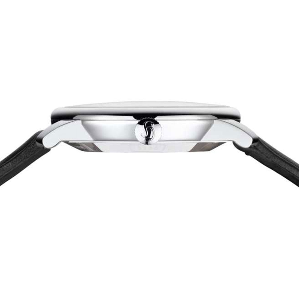- Leather strap: Black cow leather with white stitching, Alcantara lining for comfort, stainless steel tang buckle with historical logo