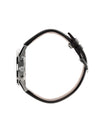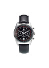 black, silver numbers and indices, date at 6 o'clock and black counters, silver luminous hour and minute hands, silver and red second hand